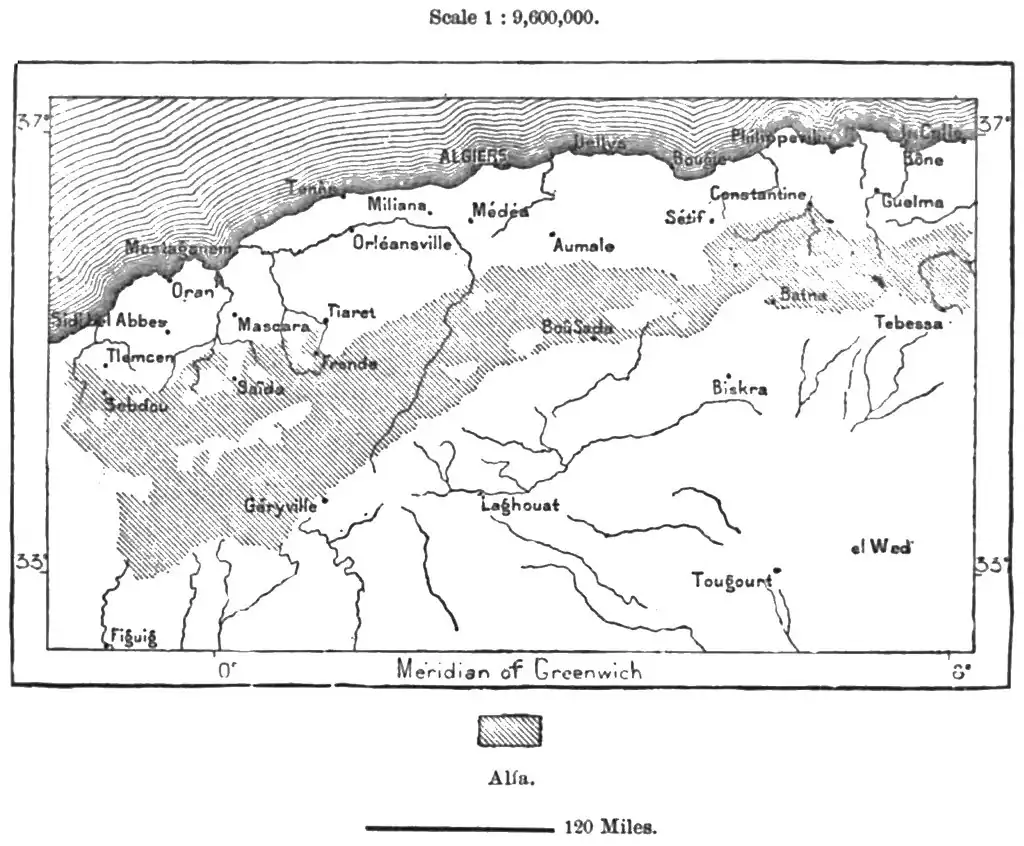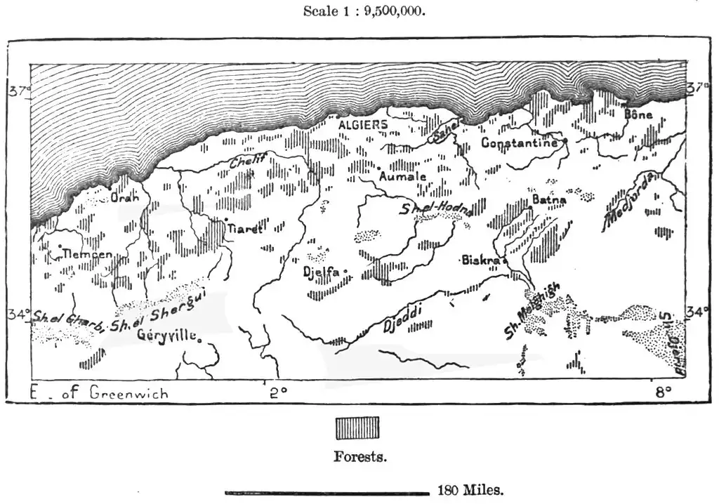 Of the vast but still scantily peopled productive lands in Algeria, only a very small portion has hitherto been turned to any account. Most of the occupied districts are either grazing-grounds left in a state of nature, or subjected to a rudimentary system of tillage. Even in the Tell vast tracts are absolutely barren, while on the plateaux argillaceous or saline wastes cover boundless spaces. Most of the now treeless northern parts might, however, be clothed with a forest vegetation, and thus play an important part in modifying the climate and developing the economic conditions of the land.