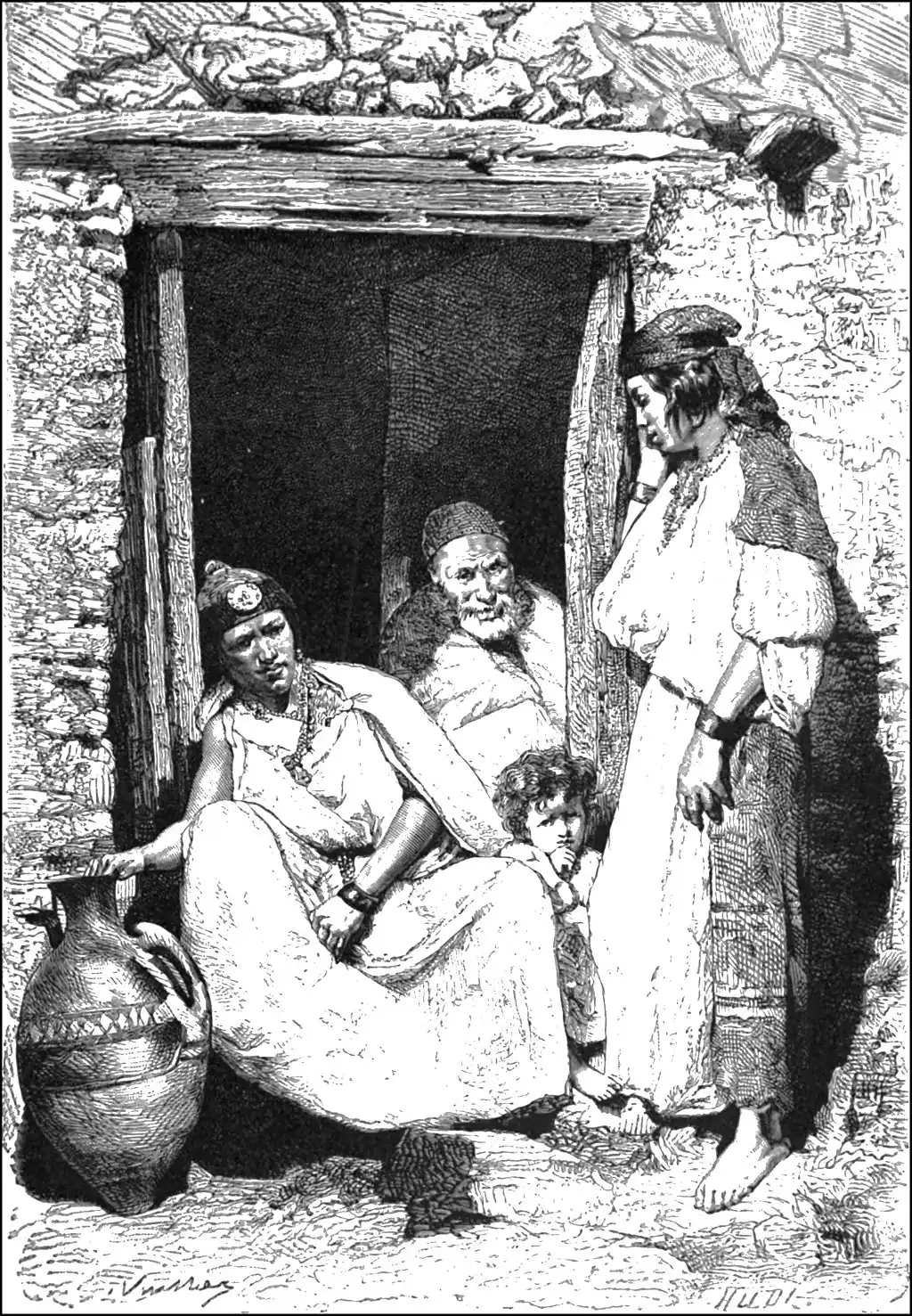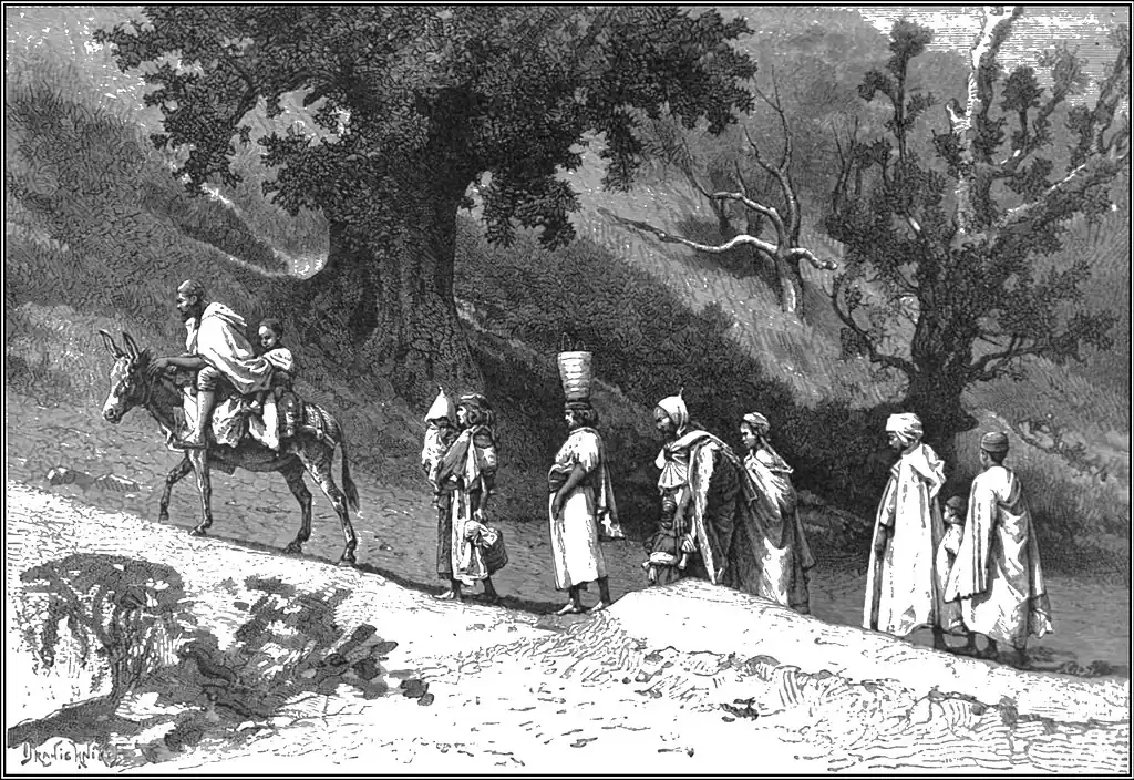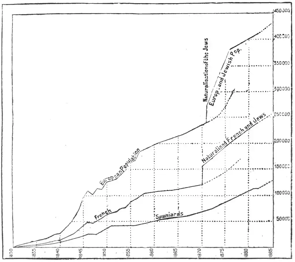 The Algerian Jews, descended for the most part from Andalusian exiles, wore all naturalised in 1870, to the great disgust of the Arab and Berber Mussulmans, who could not understand why this honour should be conferred on such a despised race, while the children of the soil were treated as a subject people. But although now nominally "French," most of the native Jews are still regarded as forming a distinct nationality. At the same time a slow process of assimilation in dress, usages, speech, and ideas is evidently going on, in this respect the second generation of Jewish settlers showing a marked advance.
