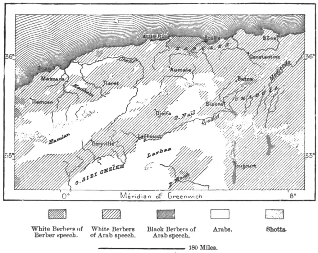 The teoond t3rpG found in the old graves resembles that of the present inhabi- tants of the oases. These have a well-bahmced cranium, straight features, and arms disposed like those of Europeans ; but they are otherwise very slim, and of low stature. People of the same type are found in the more elevated parts of the Jurjura range, where they would seem to have taken refuge, together with the monkey tribes, that have also retired from the plains to these inaccessible uplands. During the first years of the French occupation, all the natives were confounded under the common designation of Arabs ; nor is the distinction between Arabs and Berbers even now always observed. On the other hand, those who clearly recog- nise the great contrast between the two races, might easily fall into the opposite error of regarding all the non-Arab elements as forming a single ethnical group usuall}' known by the name of Berbers. But these also present different types, and a closer inspection soon shows that many peoples of diverse origin have con- tributed to form the so-called Berber population. Besides the contrast presented by groups differing in stature, disposition of the limbs, and cranial formation, there is also that of the complexion and colour of the hair. Although the prevailing colour is brown, in all the tribes men are found with light hair, and some even with blue eyes. This fair element, first described by Shaw, is numerously represented in the Aures district, and especially near Khenshela and in the Jebel Sheshar. According to Faidherbe, it constitutes about a tenth of the whole population in the province of Constantine. The Denhajas, who occupy a tributary valley of the Safsaf south-east of Philippeville, claim to be sprung of fair ancestors, although from subsequent cross- ings with their neighbours most of them have acquired dark hair and eyes. They call themselves Ulad-el- Juhala, " Sons of Pagans," and until recently they still raised on their graves huge blocks (snob), round which religious rites were cele- brated. This circumstance lends some support to the hypothesis attributing the Algerian megalitbic structures to a fair race, which came from the north through the Iberian peninsula and across the Strait of Gibraltar. But this race has also been identified with the Gaulish descendants of the mercenaries charged by the Romans with the defence of the southern frontiers, as well as with the Vandals driven by Belisarius to the Aures highlands in the year 533. Even the Romans themselves do not appear to be entirely extinct. The remains of their towns and military stations are met by the hundretl ; many thousands of their inscriptions have been collected, and on the plateaux of Constantine they seem to be still more present in their works than the French colonists themselves. Here their ruined cities are more numerous and far more extensive than the European towns of recent foundation. Even in this direction they had occupied all the highlands of Aurasius, and penetrated beyond them far into the desert. South of the province of Algiers, their monuments are also met on the verge of the Sahara ; and farther west they had built many cities, at least on the Mediterranean slo|x? of the Toll. Their colonists, settled mostly on the upland plateaux of Numidia and the 3Iauritaniau Sitifis, that is, in the regions where the climate was most suited for the preservation of their race, must certainly have left