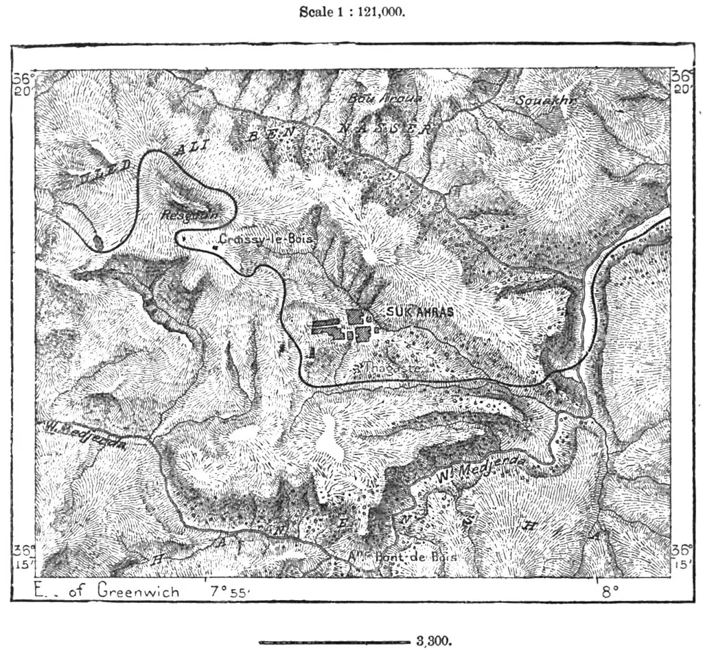 region was covered with olive groves, as is evident from the oil-presses, remains of which occur in every Roman farmstead. Suk-Ahras, the chief place on the frontier plateau, occupies the site of the ancient Thagaste, the birthplace of the famous Austin, bishop of Hippo. Until 1852 a mere military station threatened by the powerful Hanensha tribe, Suk-Ahras has since become a flourishing town, as the chief centre of trade and intercourse between the two ports of Bona and Tunis. Here large tracts have already been brought under cultivation, and the slopes of the hills, recently overgrown with scrub, are now under crops or planted with vineyards. Of Roman antiquities nothing survives except a few inscriptions and shapeless blocks; but the line of railway, here constructed through a series of deep cuttings and the Fej-el-Moktha tunnel, across the hills and down the winding Seybouse Valley, is a remarkable monument of modern engineering skill.