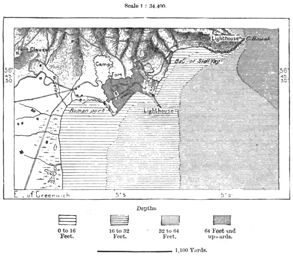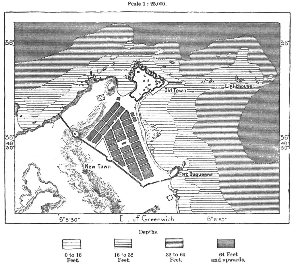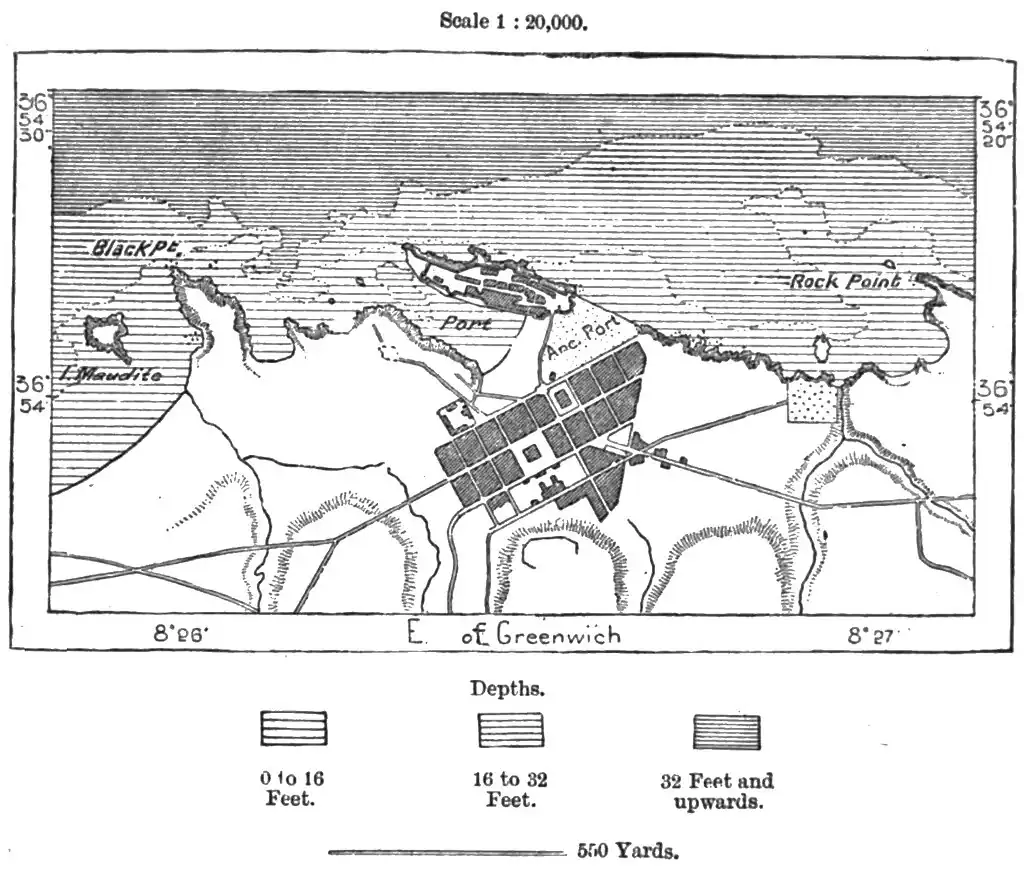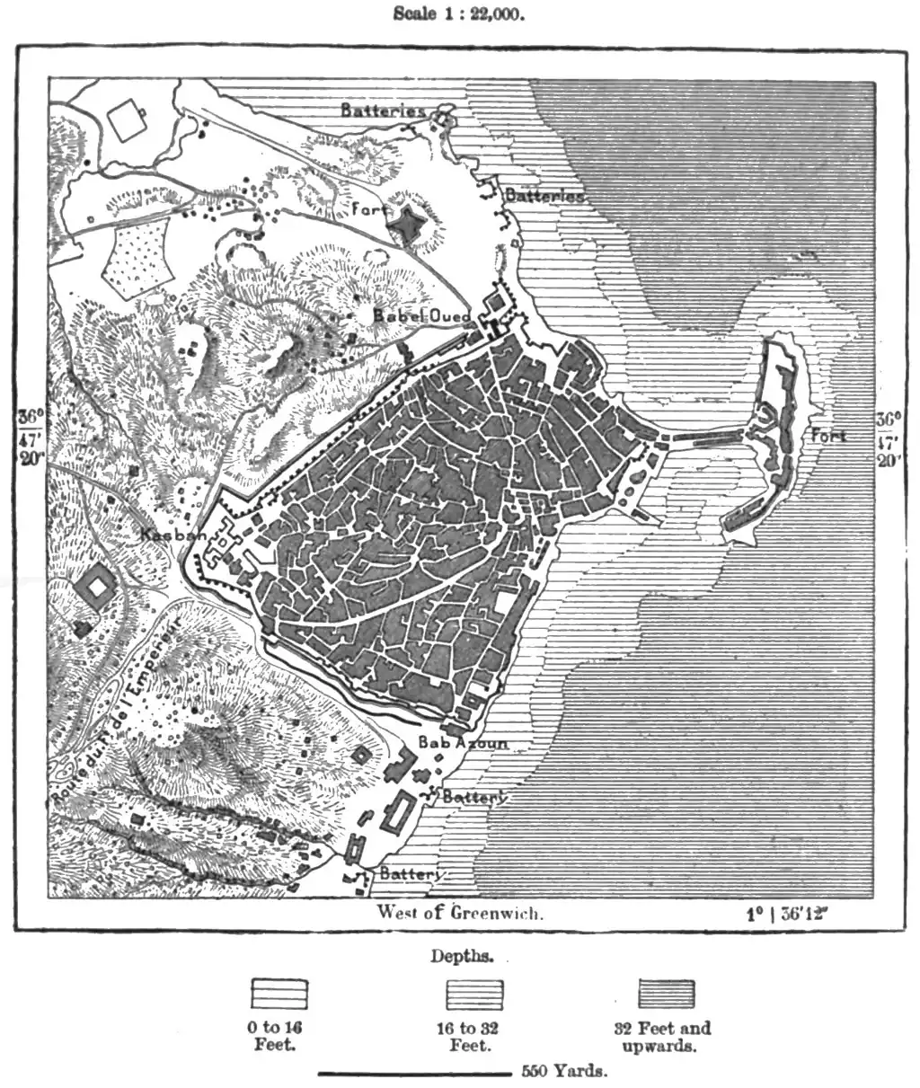 Mediæval times by European mariners, who were protected from oppressive exactions by special conventions. On two occasions, in 1152 and 1535, it even fell into the hands of the Christians, and after its final occupation by the French in 1832, it became one of the chief naval stations on this coast. The present harbour, from 18 to 20 feet deep inshore, occupies an area of about 30 acres; while the outer port, protected from the surf by a pier 2,600 feet long, encloses an additional space of 175 acres. But its growing trade, especially with Algiers, Marseilles, and Tunis, requires further accommodation, and it is now proposed to convert a large portion of the outer harbour into a second basin, lined with quays reclaimed from the sea.