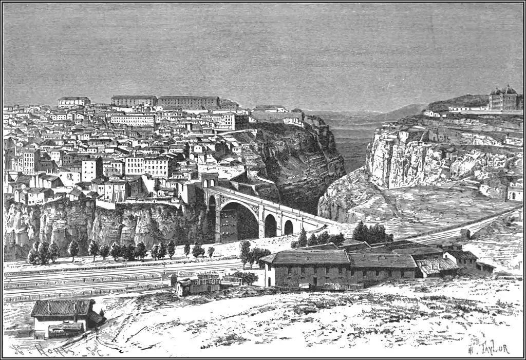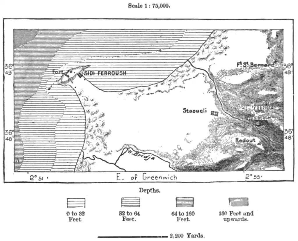 is encircled by steep cliffs, affording no space for a large town. Hence Oran lies at the extremity of the bay, where the hills disappear, leaving a wide opening landwards. From the strategic point of view this breach also offers great advantages, being defended by a natural fortress, adding greatly to the strength of the enclosures.