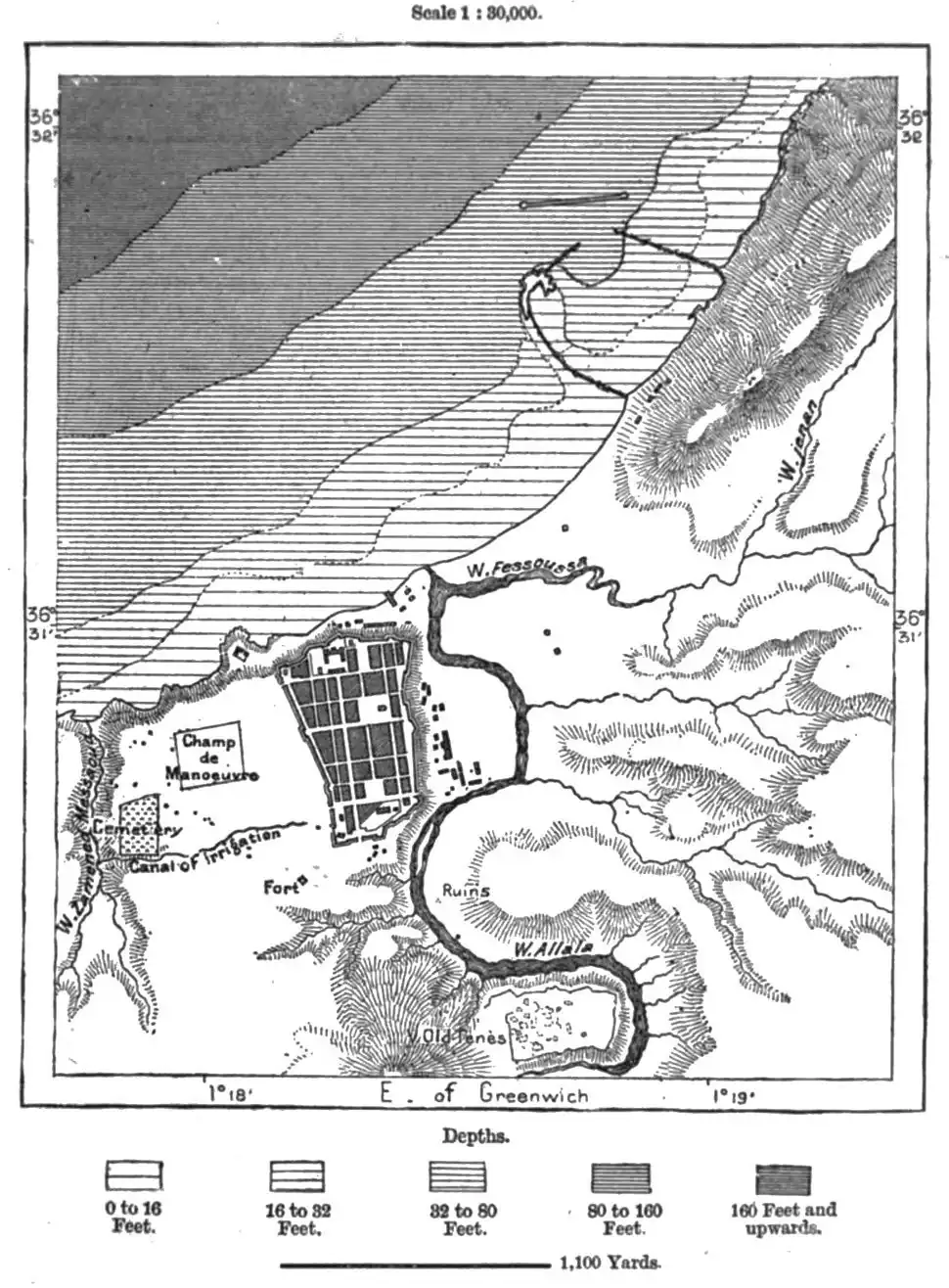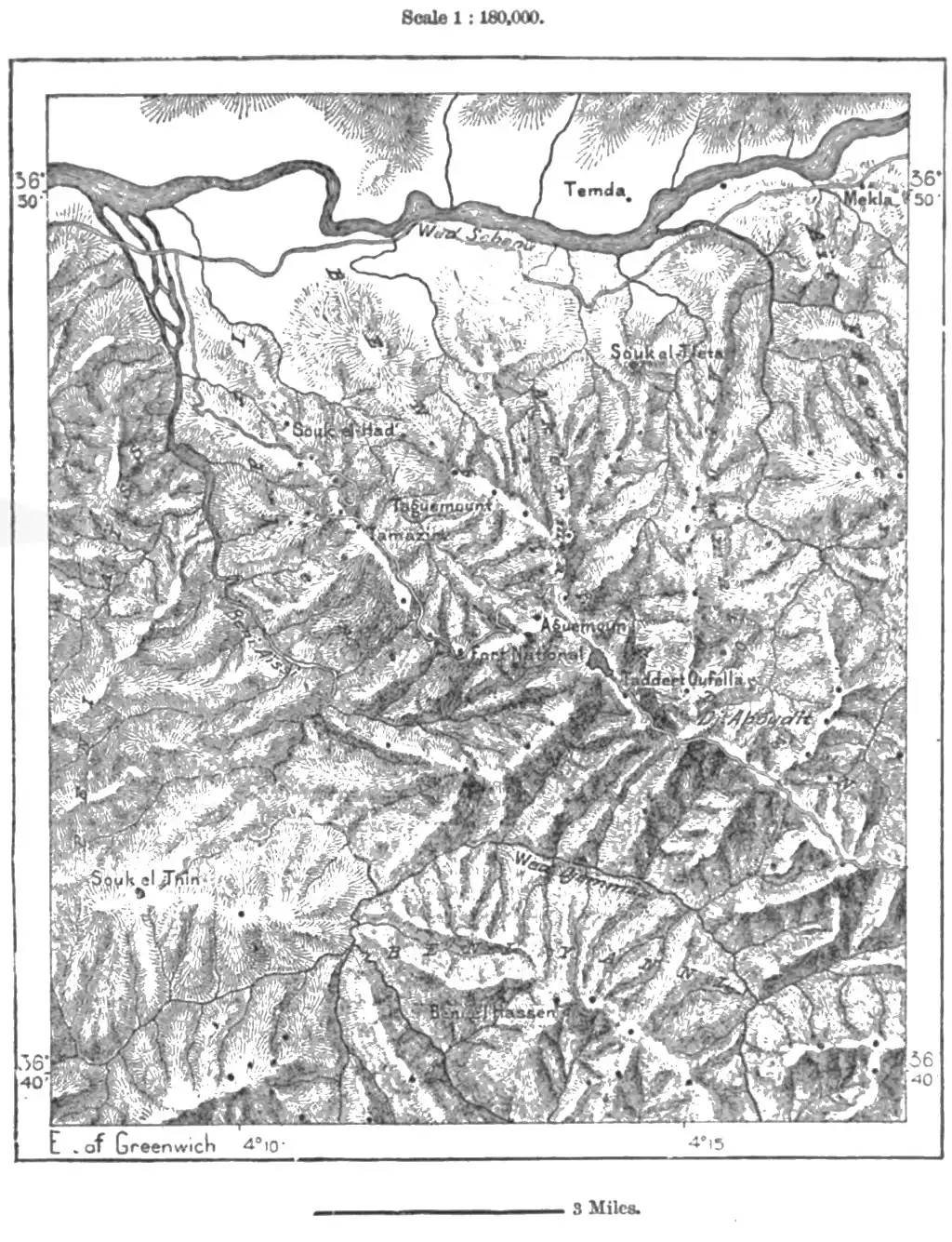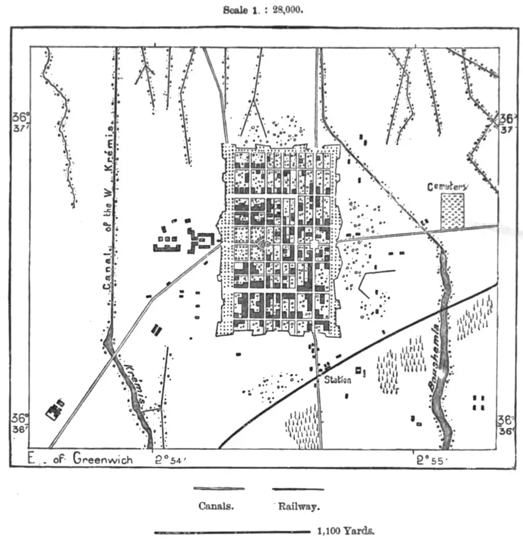 Near the confluence of the Shelif and Wed Riu stands the large village of Inkermann, while the neighbouring Mount Guezzul (3,580 feet) is occupied by Tiaret (Tiharet, Tihert), which in 1843 succeeded as capital of the district to Takdemt, or New Tiaret, chosen by Abd-el-Kader in 1886 as the central stronghold