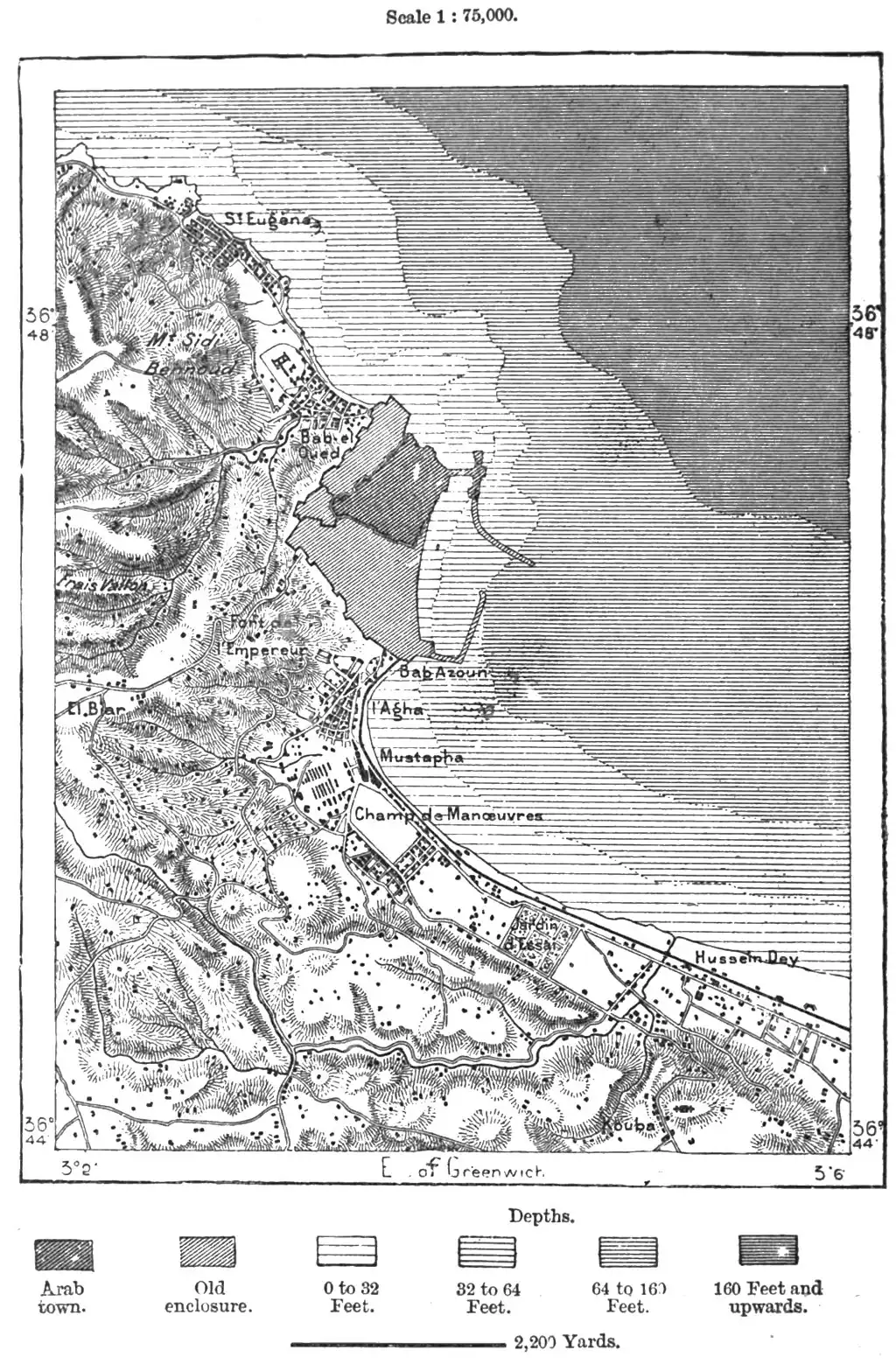 Southwards also the city is continued by the districts of Agha, Mustapha, and Belcourt, stretching away beyond the Bab-Azun, the gate where criminals were crucified, dead or alive. The united communes of Algiers, Saint-Eugène, and Mustapha have a total length of some 6 miles, although, at many points hemmed in between the hills and the sea, the city is scarcely more than 200 yards broad.