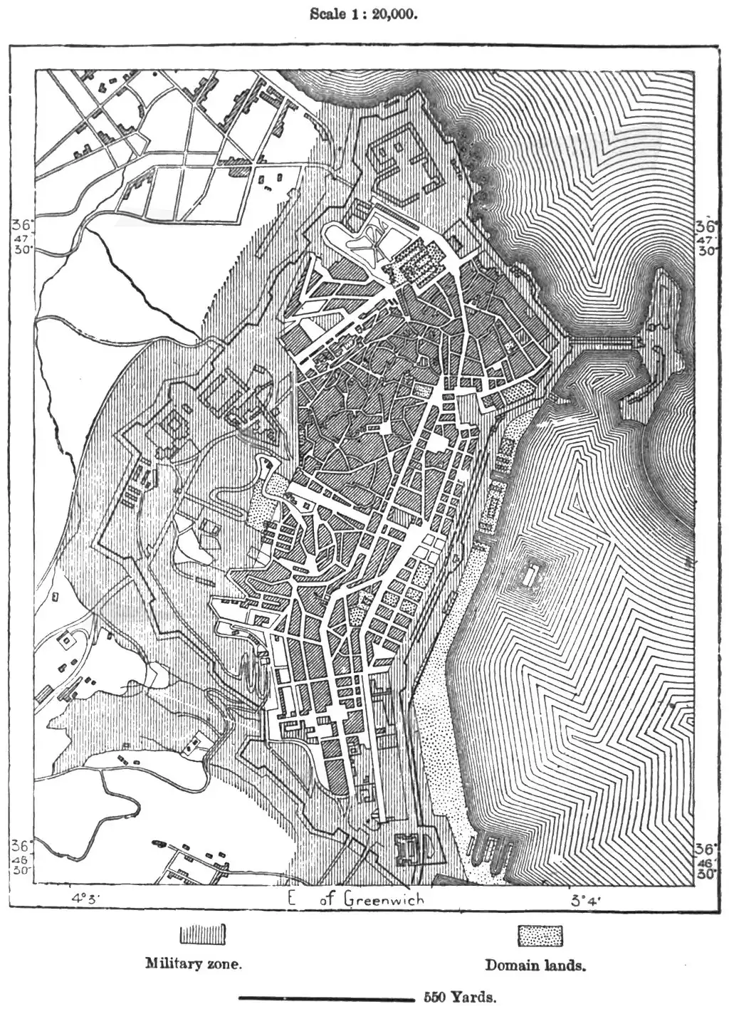 The town occupies a ravine between the two ridges of Bu-Jala and Jebel Addun, east and west. The main thoroughfare, running along the old bed of a stream, terminates seawards in an elevated terrace, whence a view is commanded of the esplanade and of the inner and outer harbour, the former covering an area of 50 acres, and enclosed by jetties, the latter much more extensive, but insufficiently