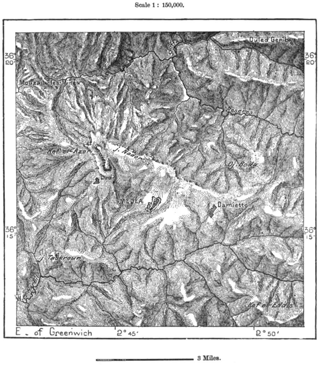 One of the best-defined ranges in Algeria is that of Jurjura, the Mons Terratus of the Romans, which runs east and north-east of the Titteri hills. Although its highest point is only 7,680 feet, or somewhat less than the Sheliya of Aures, it rises to a greater relative height above the plains than any other range in the country. Seen from the north it presents an imposing appearance, being hero skirted throughout its whole length by a deep wooded and cultivated valley, which forms a pleasant foreground to its rugged and snowy peaks. In this direction the snows are more abundant than on the opposite slope, and in the depressions traces