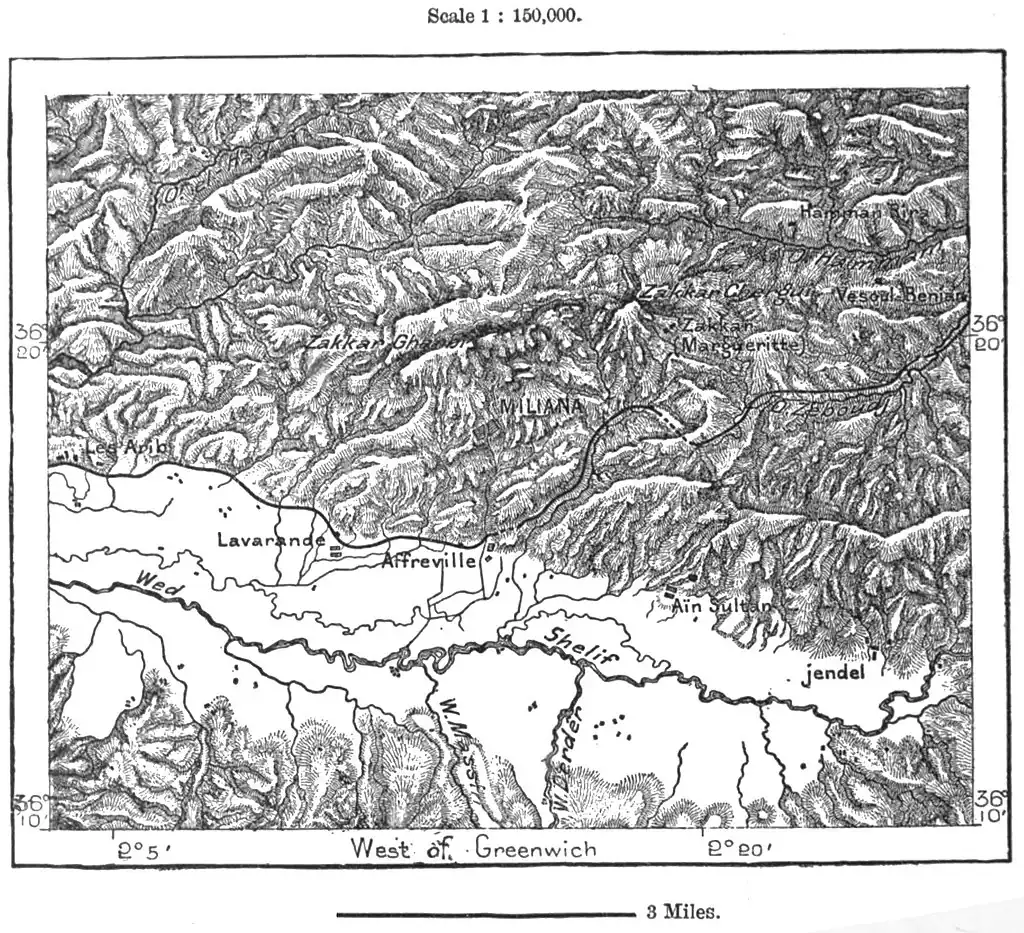 occupied by the town of Miliana, at an altitude of 2,460 feet. From this commanding position a view is afforded of the vast amphitheatre of blue hills stretching beyond the sharp peaks of the Warsenis. The present town, rebuilt by the French, preserves no remains of the Roman Malliana, and very few of the more recent Arab buildings. The neighbouring vineyards yield a highly esteemed wine.