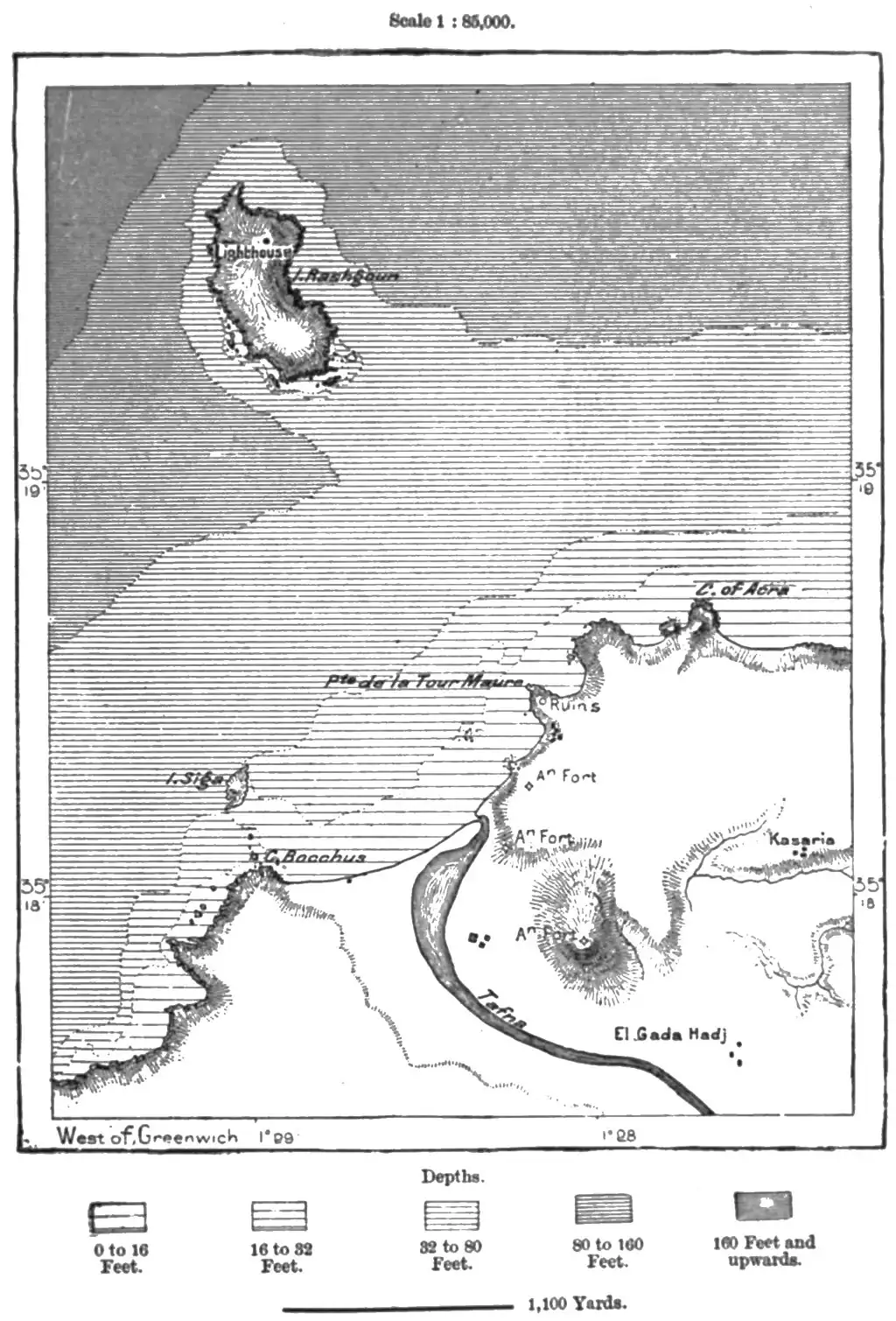export trade, especially in the excellent iron ores worked by over one thousand miners in the neighbouring metalliferous district. Over a mile from the mouth of the Tafna lies the island of Rashgun, the Arshgul of the Arabs, which affords a shelter to the approaches of the river. Near the lighthouse at the north end of the island are the ruins of an Arab town, and other remains are strewn over the whole seaboard. North-east of Beni-Saf stand the vestiges of the Roman port of Camarata. South of Rashgun are the scattered stones of Takebrit, or the "Vaults," occupying the site of the ancient Siga, and to the west the fragments of an ancient enclosure not far from Cape Honein, a name transformed by seafarers into that of Noah, At this point, overlooked by the escarpments of the Jebel Tajara, stood the important Arab town of Honein, one of the outports of Tlemcen before the conquest of Oran by the Spaniards.