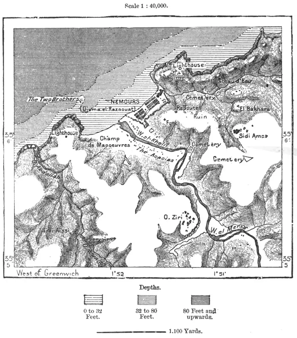 Between the Tafna and the Murocco frontier the modern French seaport of Nemours occupies the site of the Arab town of Jemâa-el-Ghazawat (Rasaat), the