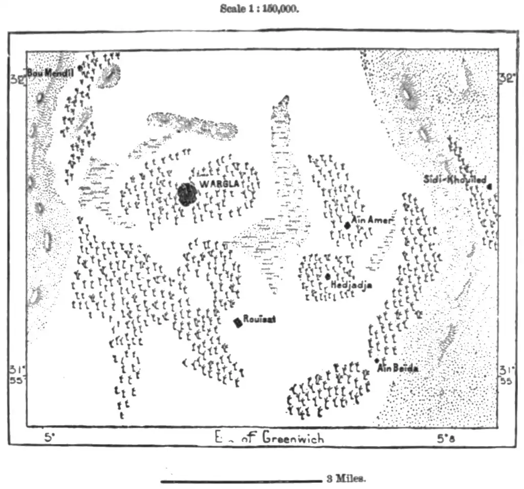 A zone of artesian wells, analogous to that of tho Wed Righ, occupies the depressions in Wargla and the surrounding oases. The total eupply, of about 35 cubic feet per second, has been greatly increased by numerous fresh borings