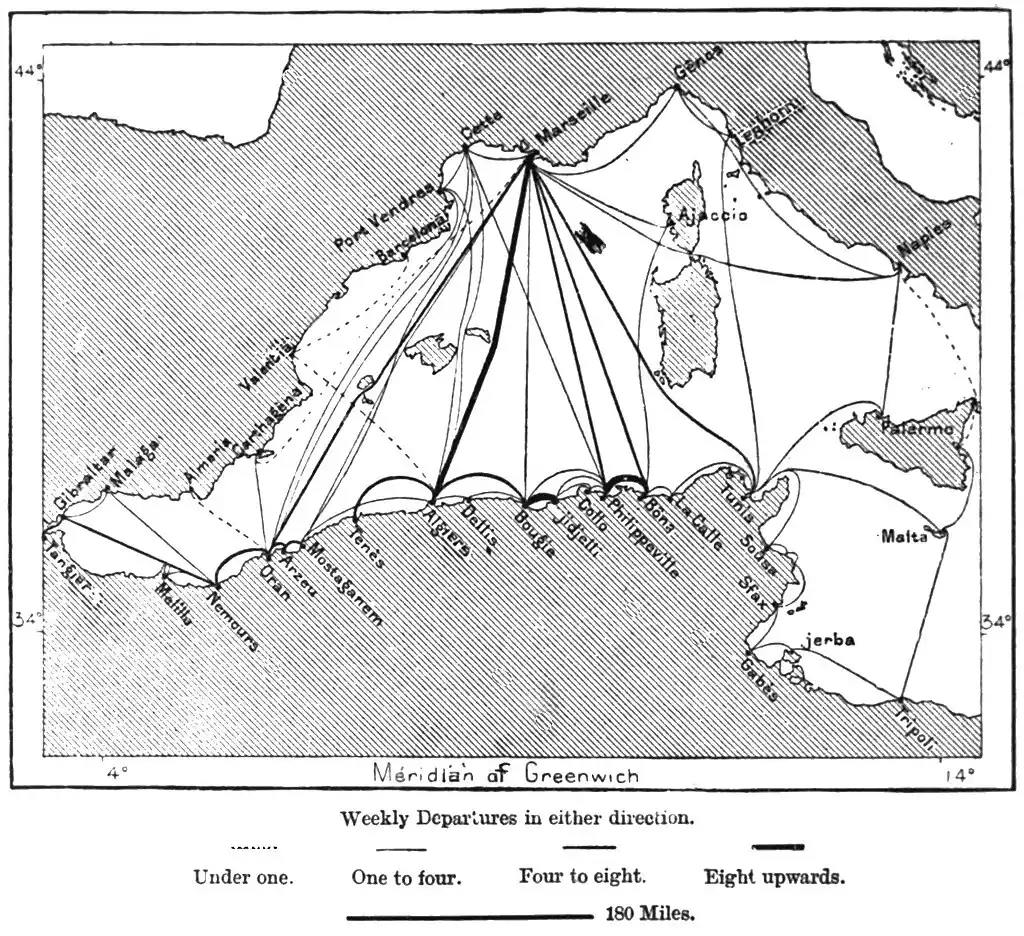 A regular service of steamers is maintained between the Algerian seaports and those of the Western Mediterranean basin, About thirty trips are made on the average every month across the intervening waters; but in this growing traffic a very small part has hitherto been taken by Algeria itself. The land communications in the interior are also well developed, and in proportion to its population Algeria has more carriage roads than France. The stranger visiting the outskirts of Algiers and the other large towns, is surprised to find so many broad, well-kept