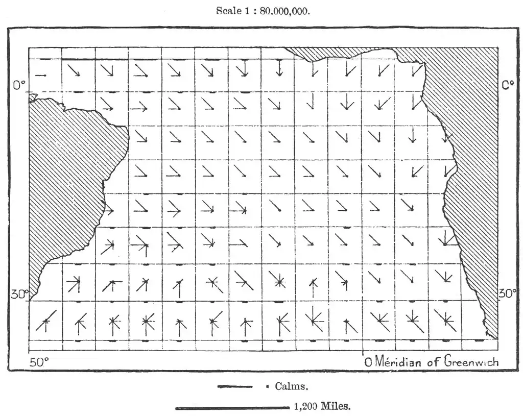 The most powerful of these backwaters is that which skirts the continental seaboard between Cape Palmas and the Bight of Biafra, and which sets from west to east with a mean velocity of a little over two-thirds of a mile an hour. But off Cape Palmas it attains an occasional speed of 3½ miles, or nearly 90 miles a day. This "Guinea Stream," as sailors call it, intervenes between the two sections of the equatorial current, which flow from the Old towards the New World, so that a vessel sailing either east or west parallel with the equator may take advantage either of the main or the counter current to accelerate its speed. The Guinea Stream shifts with the seasons, in September occupying more than half the breadth of the Atlantic to the south of the Cape Verd Islands.