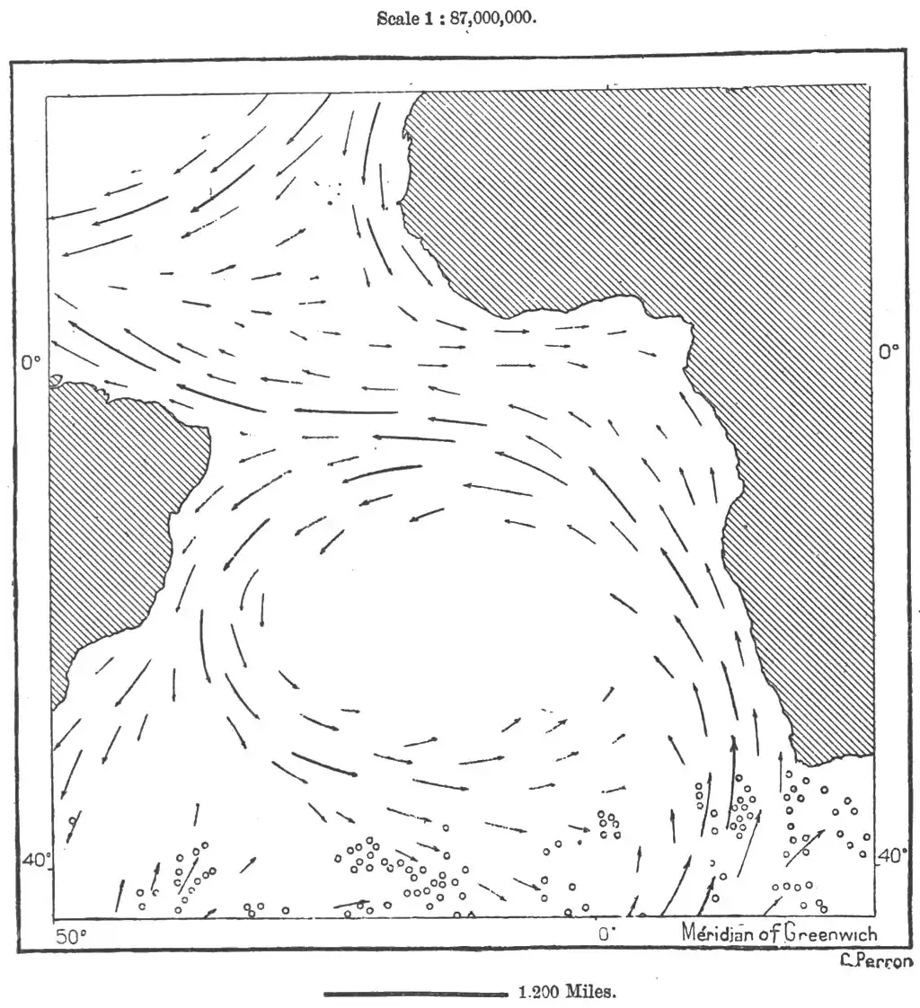 The cause of this movement from west to east in the same direction as that of the globe itself, is a question that cannot be discussed apart or independently of the still unsolved general problem of the circulation of the oceanic waters. The part played in these movements by the rotation of the globe, by the winds, the varying temperature from the surface downwards, the varying degrees of salinity