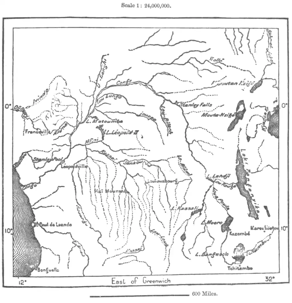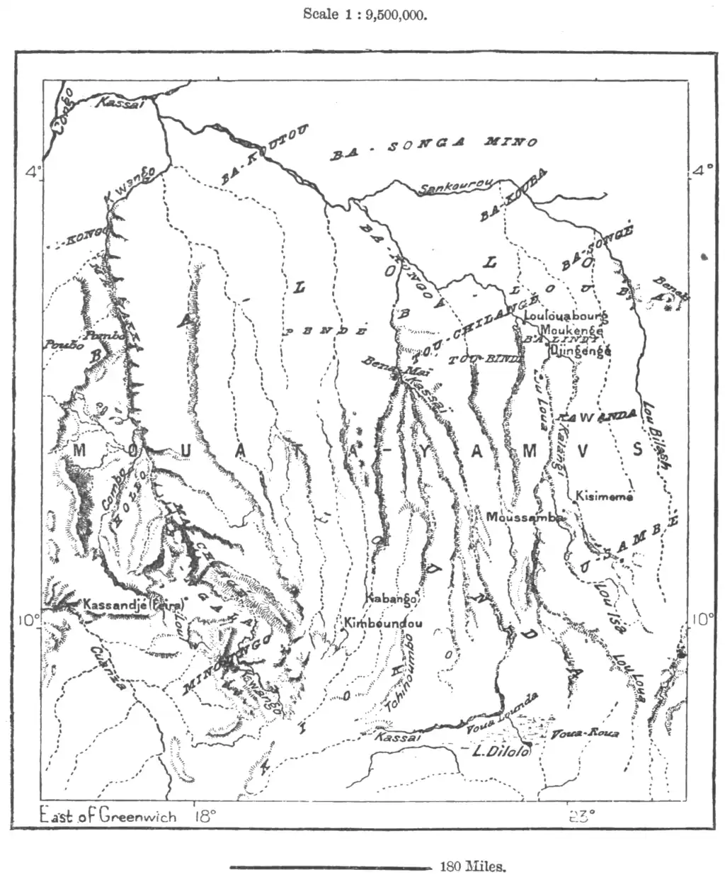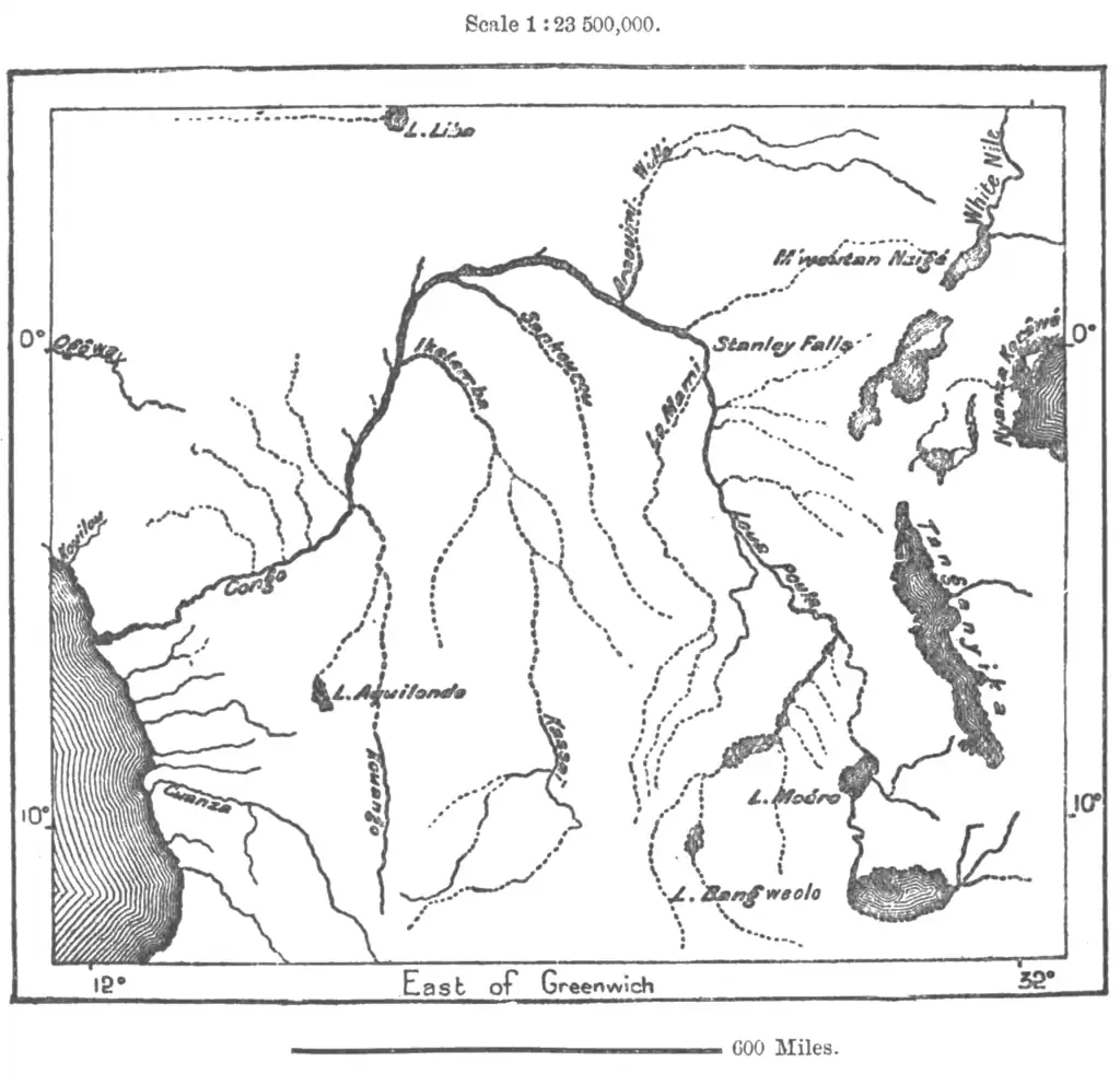The new empire, entitled the "Congo Free State," is limited southwards by the estuary, and thence by a geometrical line drawn to the Levee, some 12 miles north of the sixth parallel of south latitude, which parallel it forth follows to the Lu-Bilash, or Upper Sankuru river. At this point the conventional frontier, drawn across unexplored or little known regions, trends southwards along the Lu-Bilash valley towards its source on the plateau, beyond the Congo-Zambese divide, following the left side of Lake Bangweolo and the Lua-Pula valley to Lake Moero, and thence in a straight line to Cameron Bay, at the south-west extremity of Tanganyika. From this point it runs nearly due north along the west side of Tanganyika and east of Lake Muta-N'zige to 4°N. latitude, which has been adopted as its northern limit, westwards to the U-Banghi river, which, with the right bank of the Congo as far as Manyanga, separates the new state towards the west from the French possessions. Below Manyanga, a tortuous line passing south of the sources of the Niari and its affluents westwards to the coast between Cabinda and Banana, completes the vast periphery of the Congo State, which comprises about half of the fluvial basin, or 780,000 square mikes in superficial extent. But of this vast domain, only a few riverain stations have been occupied, such as Ba-Ngala on the right bank of the Congo in the territory of the Ba-Ngala nation, and Luluaburg, on the Lua-Lua affluent of the Kassai.