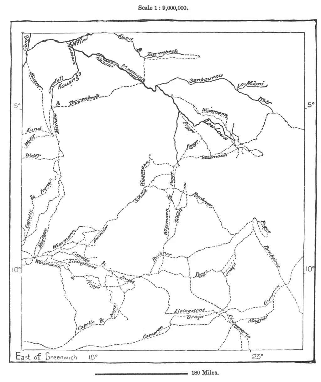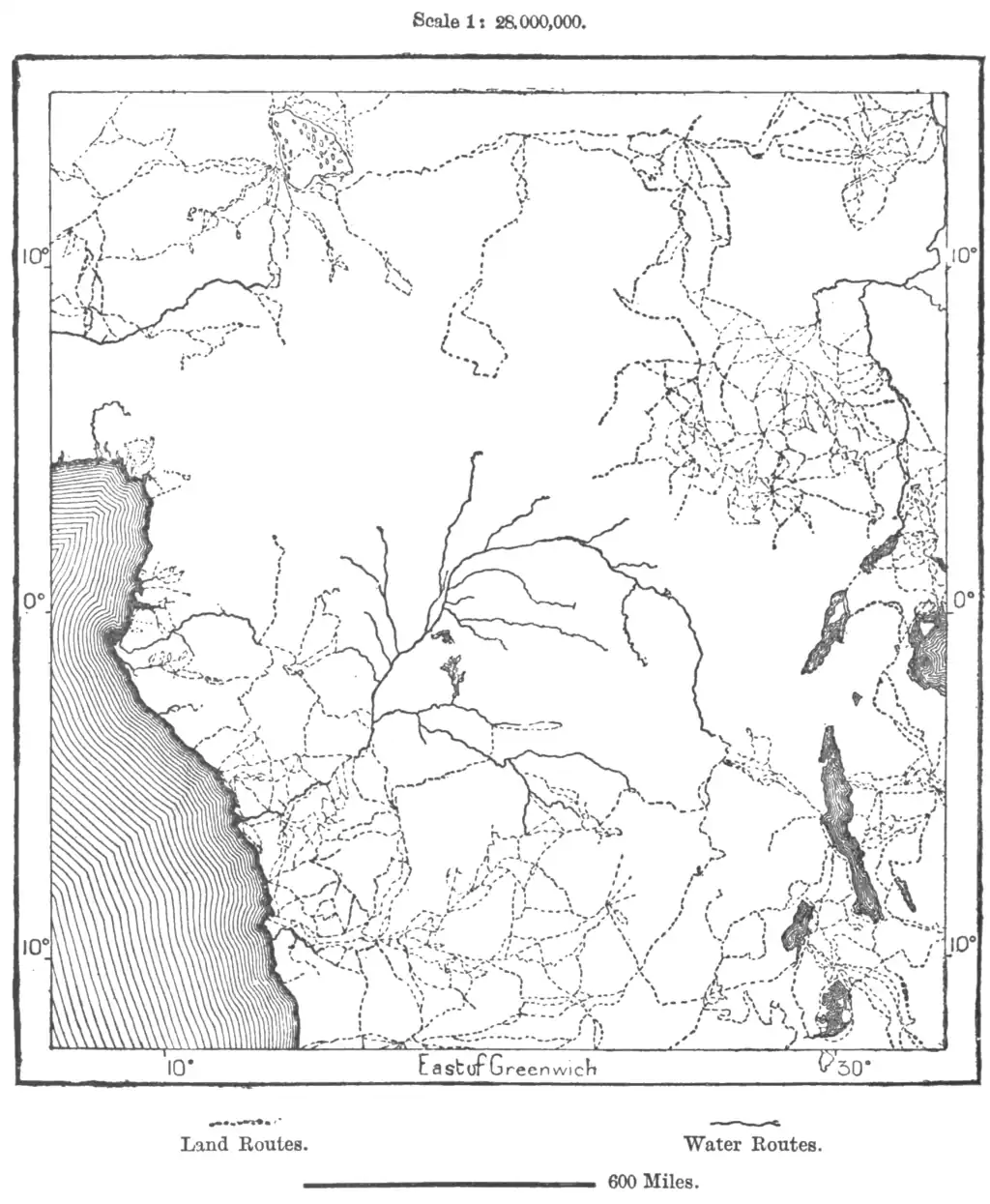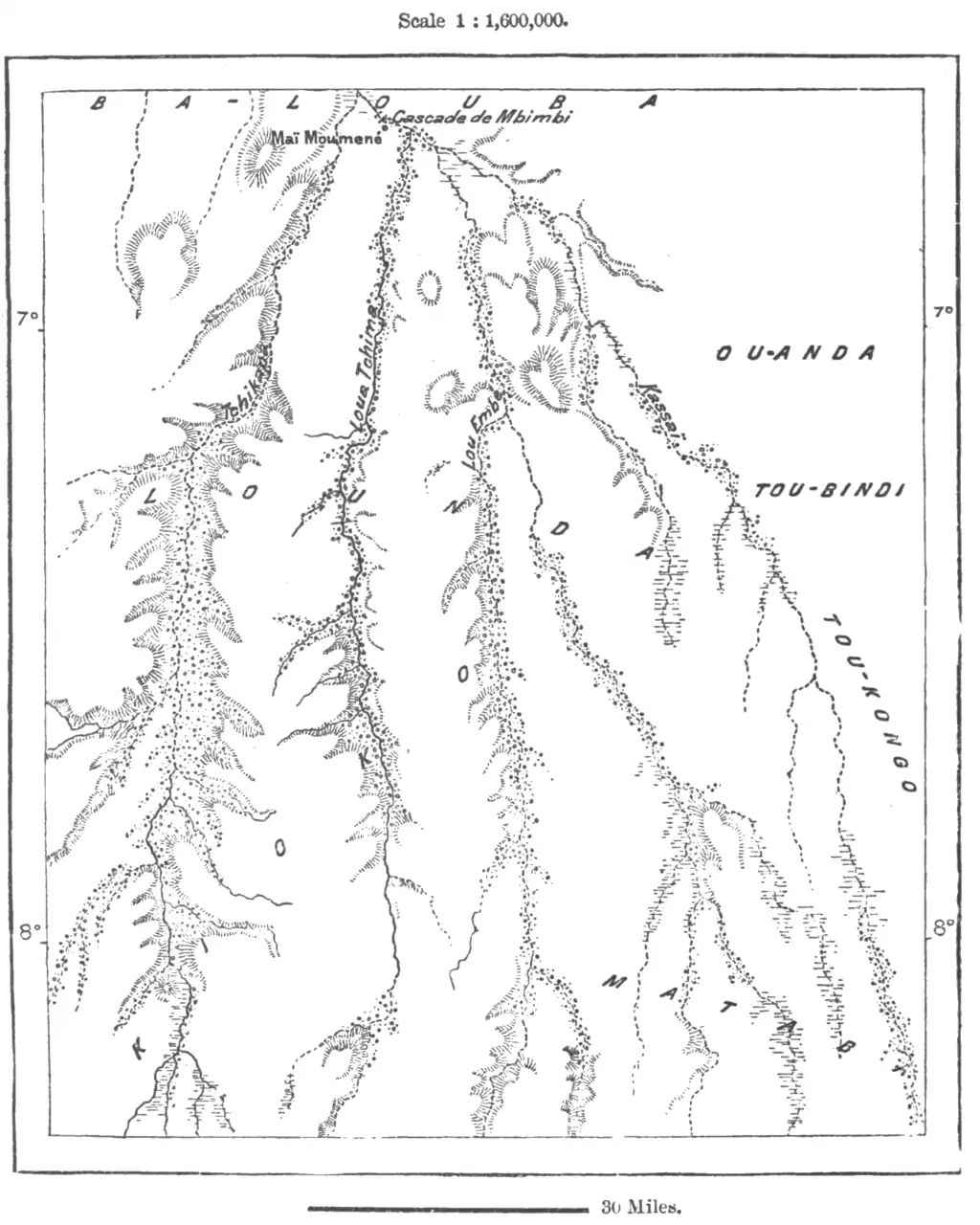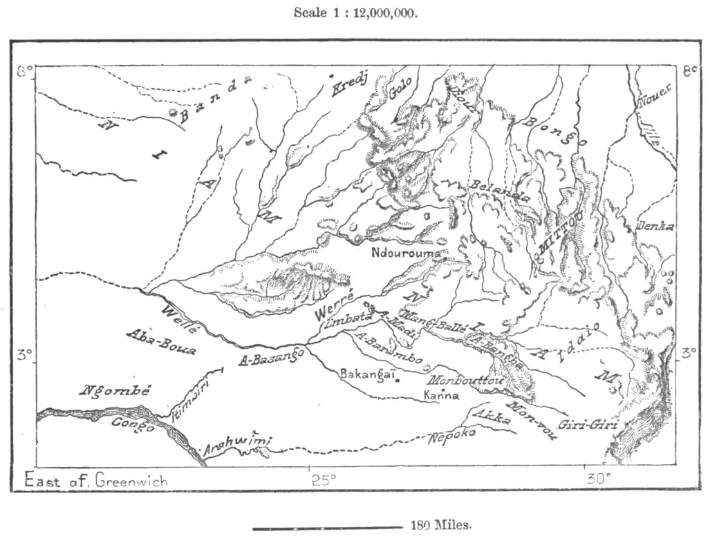 When Schweinfurth penetrated for the first time into this region he had good reason to cal] it the "Heart of Africa," for here lies the point of intersection for the diagonal continental lines drawn from the mouth of the Congo to the Nile delta, and from the Gulf of Guinea to that of Aden. Yet this divide between the two great fluvial systems is still but little known. After Schweinfurth's