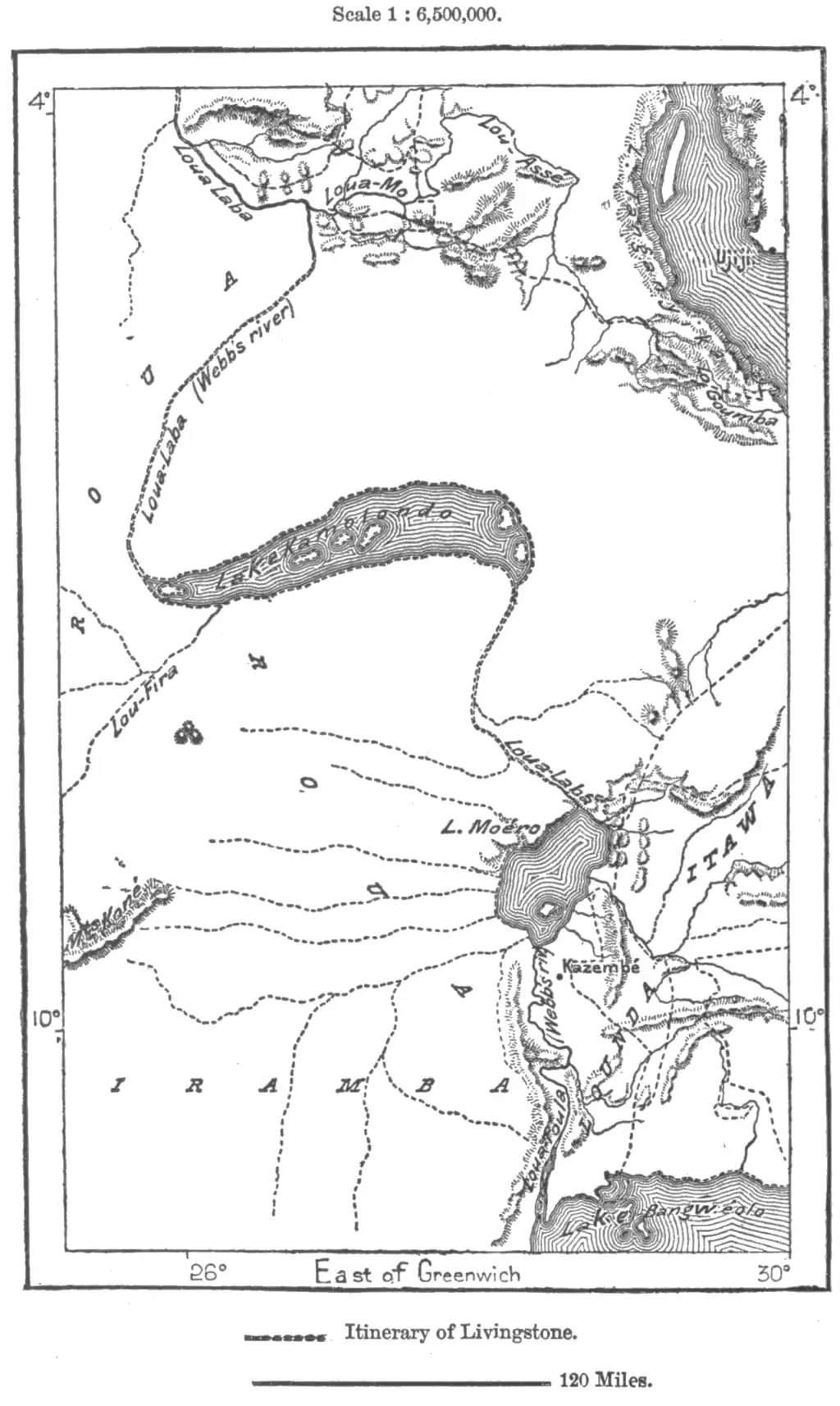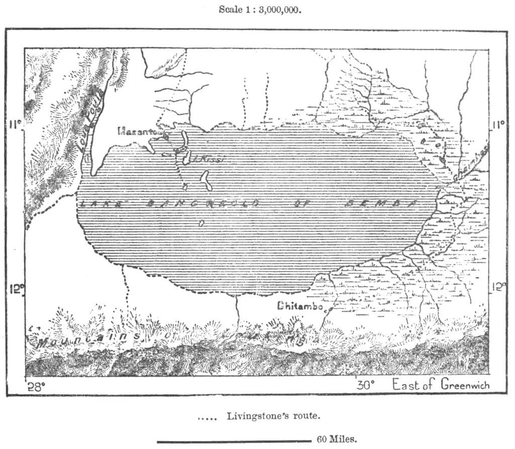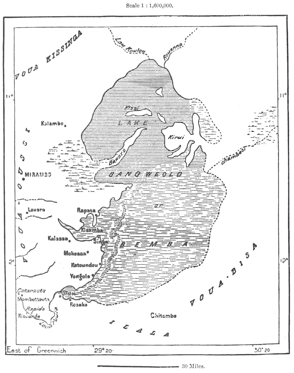 Bangweolo, discovered in 1868 by Livingstone, and revisited by him five years afterwards to end his days on its southern shores, is an extremely irregular lacustrine