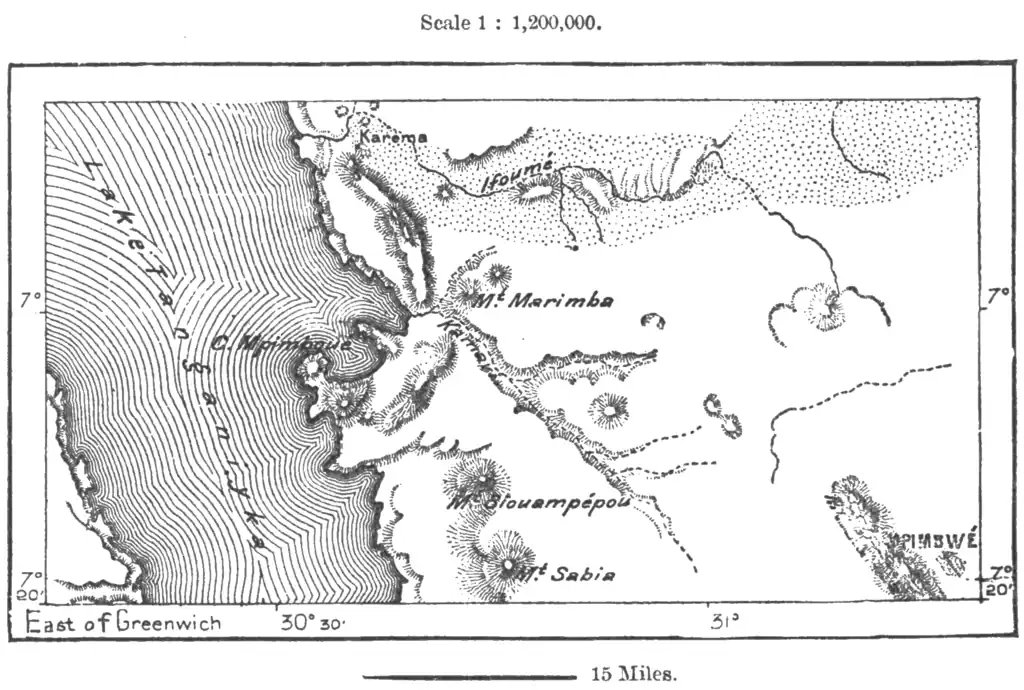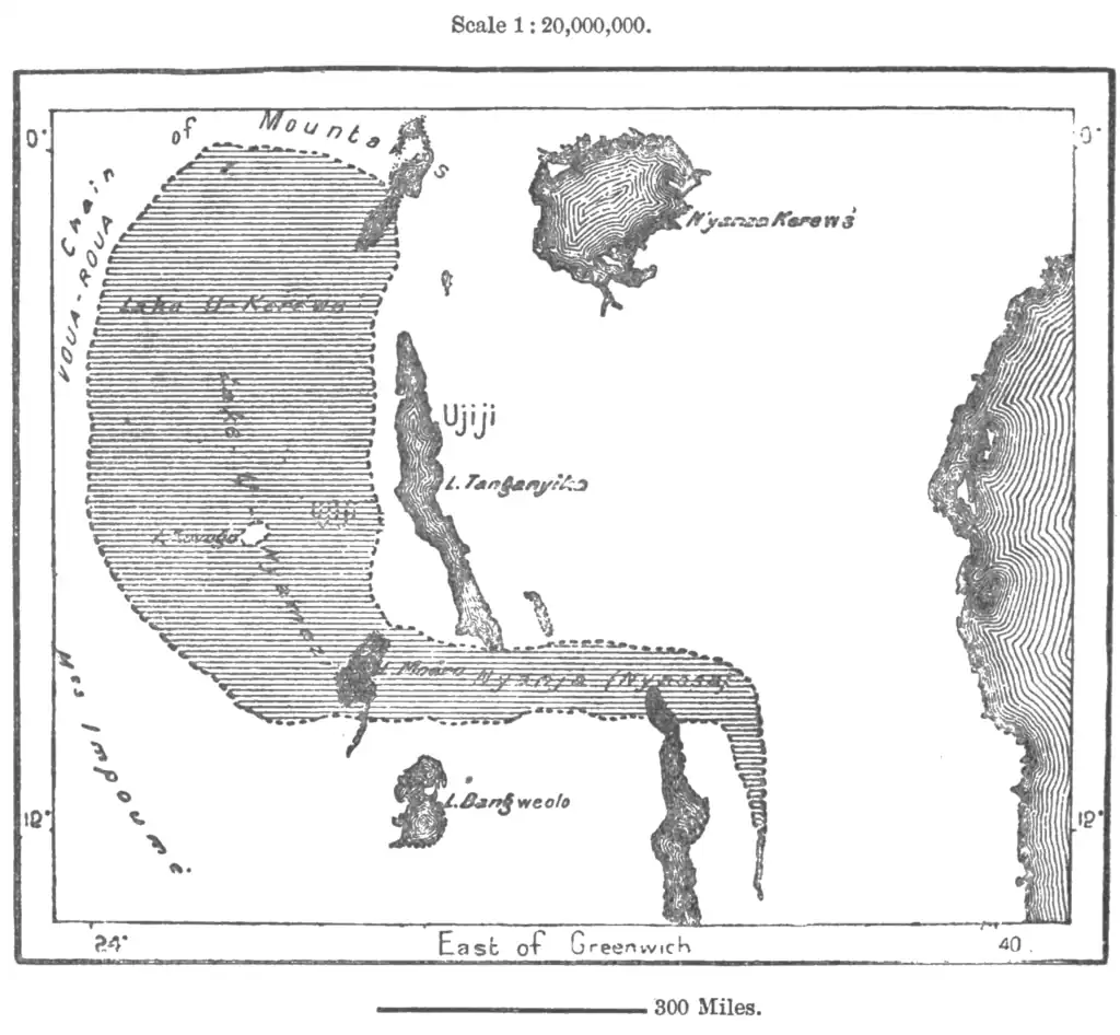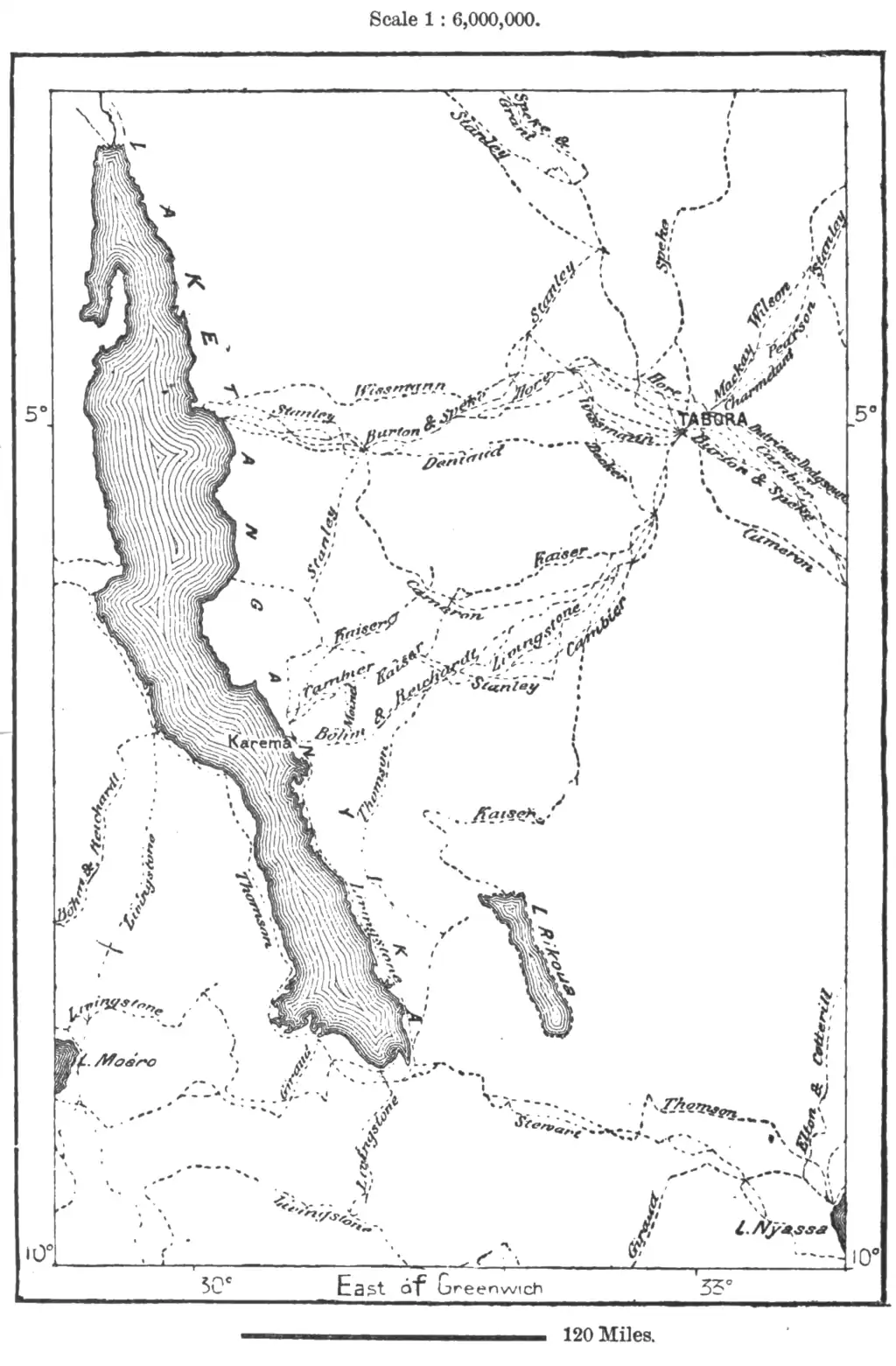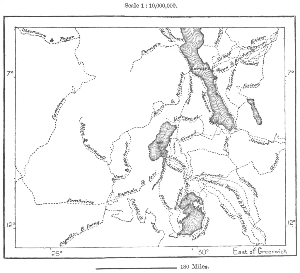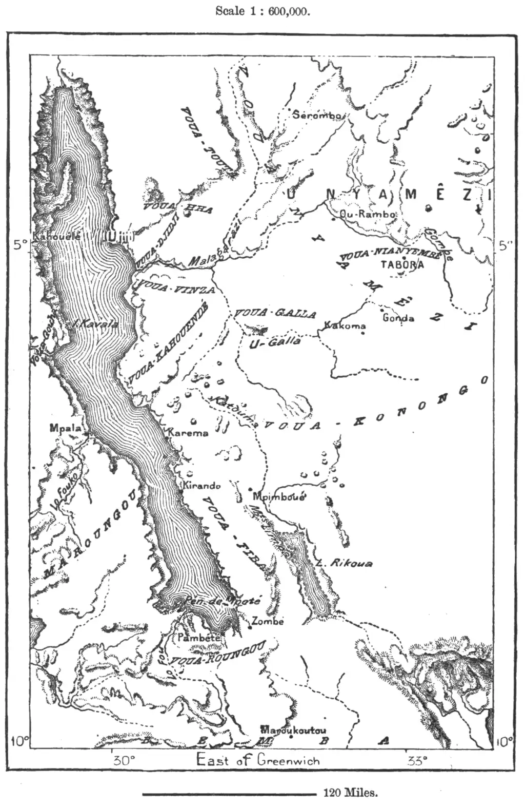 Tanganyika was long known to the Portuguese and Arabs, and is mentioned under various names in numerous documents of the eighteenth century, although generally confounded with Nyassa and other lakes. The three basins of Nyassa, Tanganyika and Nyanza are even merged in a single inland sea stretching north and south across thirteen degrees of latitude, and still figured as Lake U-Nyamezi on Erhardt and Rebmann's map of 1856. But this great Mediterranean has been resolved into its three constituent elements-by the memorable voyage of Burton and Speke in 1858, and the subsequent explorations of Livingstone and Stanley. Of all the Central African lacustrine basins, Tanganyika is now the best known, and a comparative study of Livingstone's map with accurate subsequent measurements shows that it had already been carefully surveyed by the first explorers. From Pambete Bay at the southern to the Ru-Sizi mouth at the
