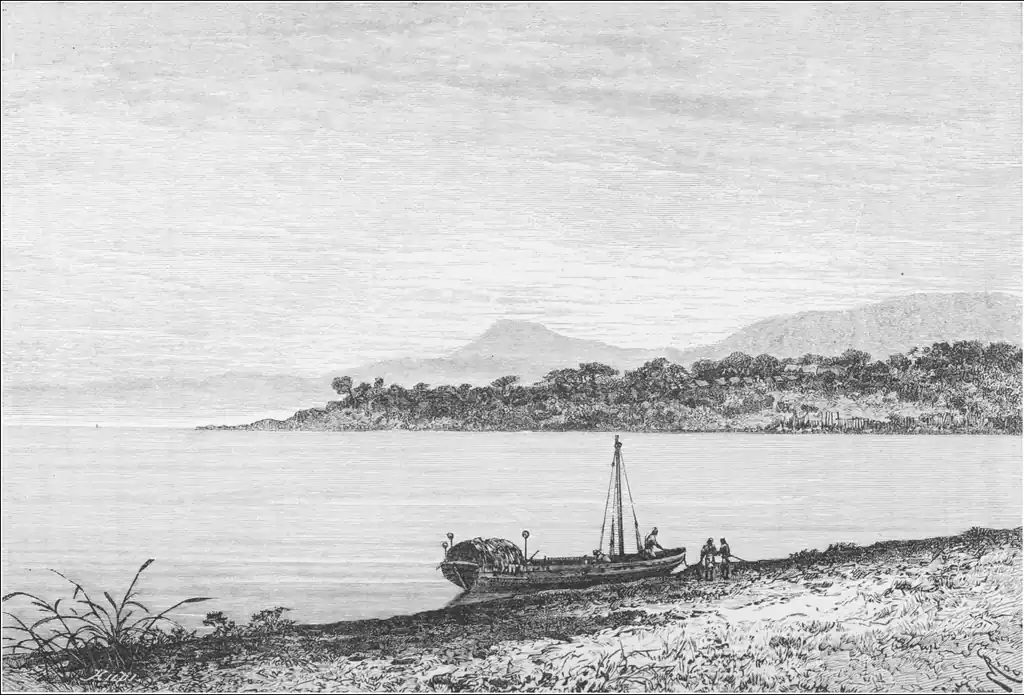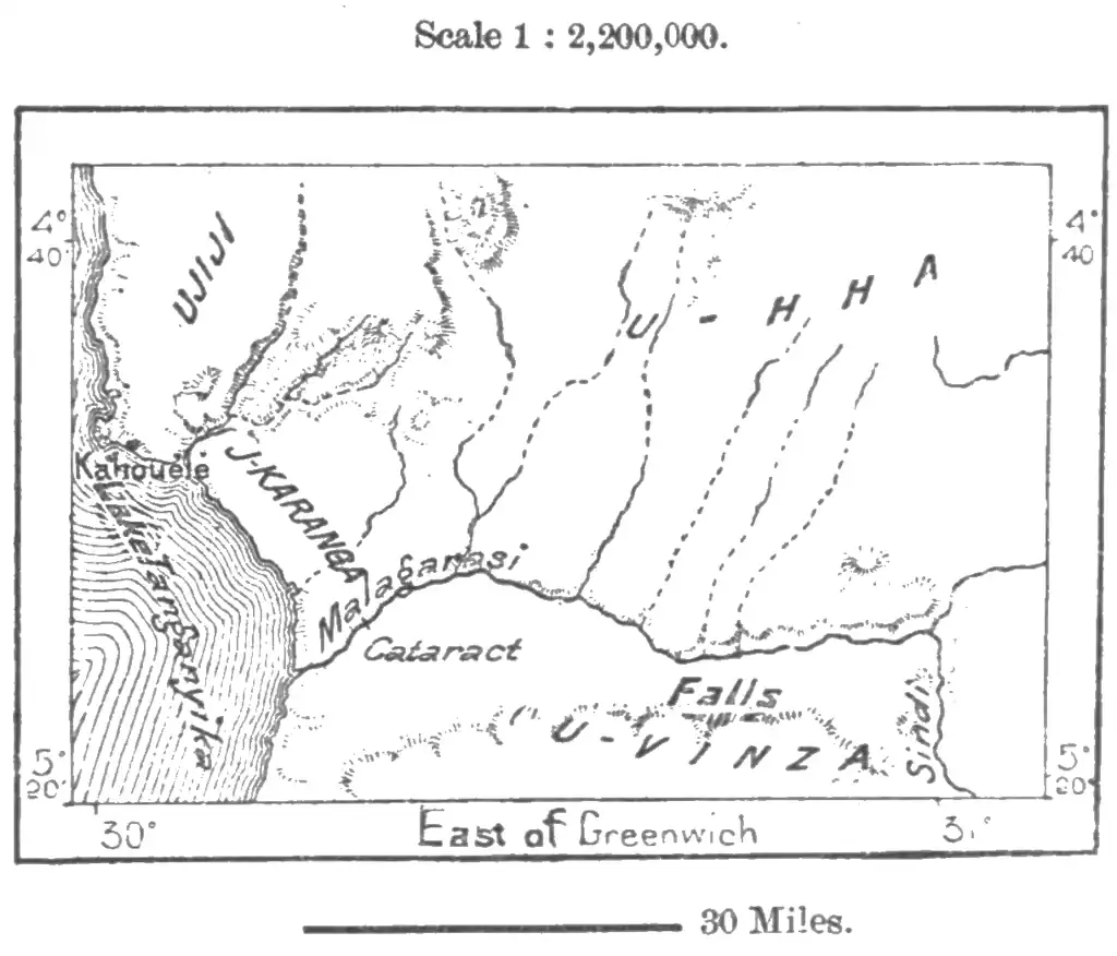 northern end, it has a total length of 380 miles, but a mean width of not more than 30 miles. It is of regular form, and nearly destitute of islands and other salient features, beyond the long U-Buari peninsula on the north-west coast. Tanganyika presents a striking resemblance to Nyassa, both basins being of the same form, disposed in the same direction, of the same general aspect, and doubtless