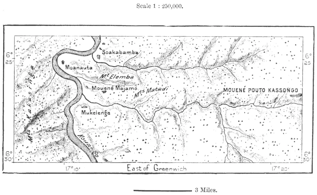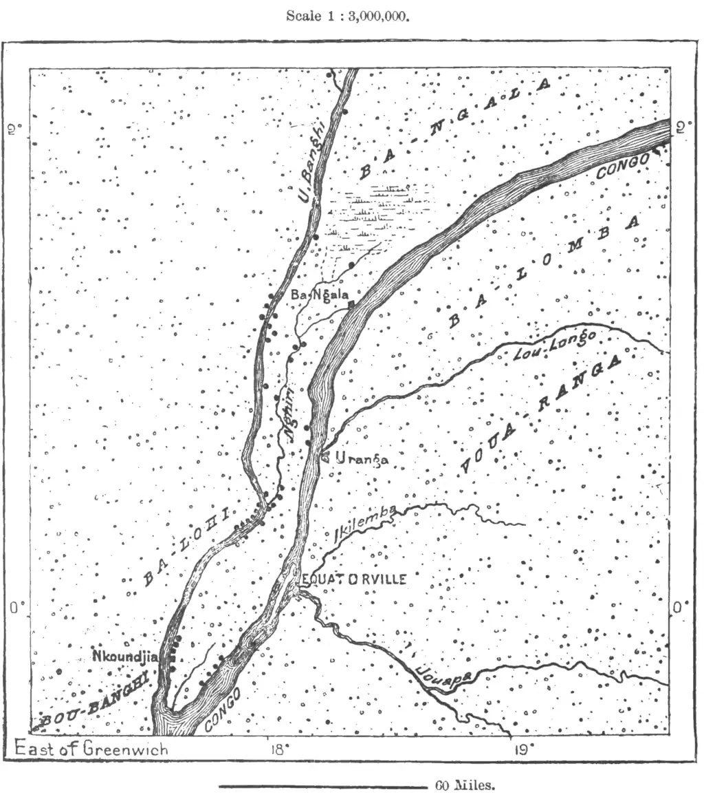 The projected station of Upoto promises one day to be a place of some importance. The site chosen lies on the right bank of the river at the foot of the Upoto hills, and not far from the northernmost point of the curve described by the Congo north of the equator. Farther down the point, where the river trends sharply to the south-west, is occupied by the station of Ba-Ngala (Bangala), so named from the inhabitants of the district, estimated by Grenfell at one hundred and ten thousand, and by M. Coquilhat at one hundred and thirty-seven thousand on both sides of the Congo. They have some very large villages stretching for miles along the riverain tracts, and Ba-Ngala itself, of which the European station forms part, is said to be scattered over a space of no less than 20 miles.