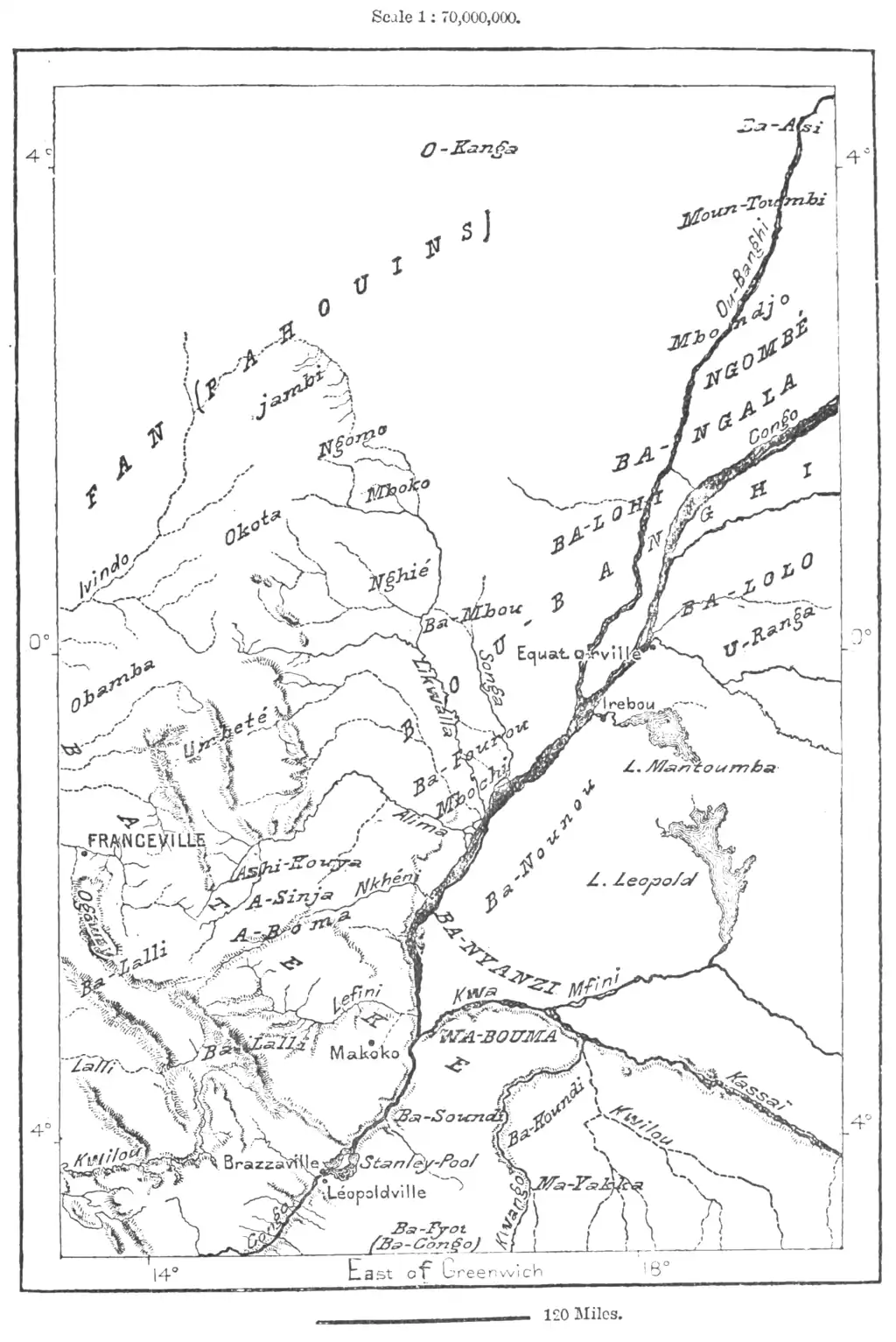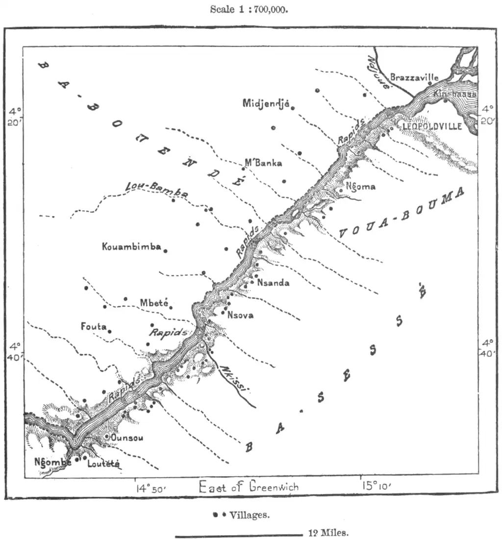 The stations of Nyombe, Lukolela, and Bolobo, on the left bank of the Congo above Kwamouth, although abandoned by the Congo Government, are still frequented trading places. Bolobo, with its suburb of Moye, is a large town of from five thousand to ten thousand inhabitants, and is succeeded 30 miles higher up by Tchumbiri, also a populous place. Here the dominant riverain people are the Ba-Yanzi (Ba-Nyanzi), akin to the Bu-Banghi on the opposite side of the Congo. Although a treacherous, insolent race, addicted to orgies and human sacrifices, they show great ingenuity and artistic taste in the decoration of their