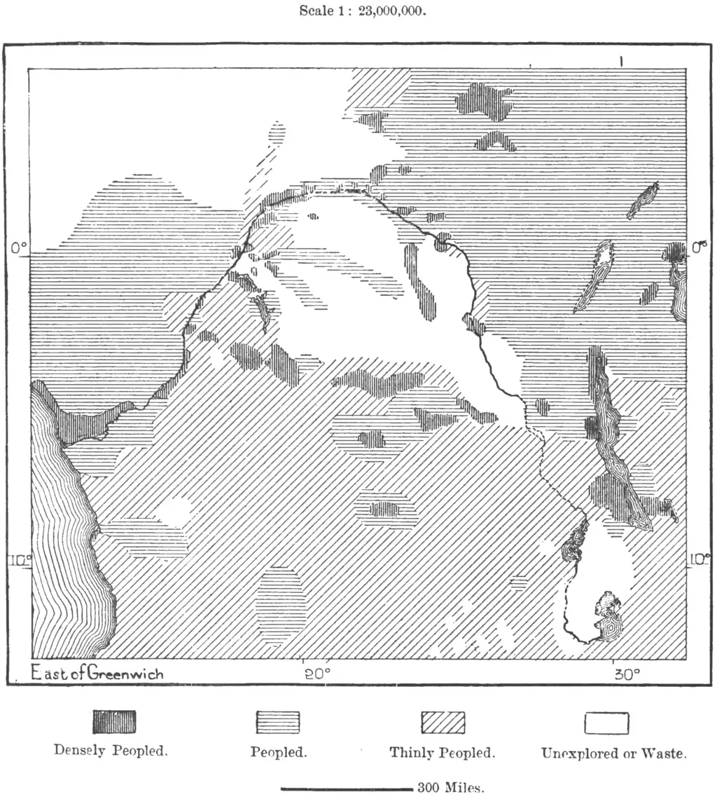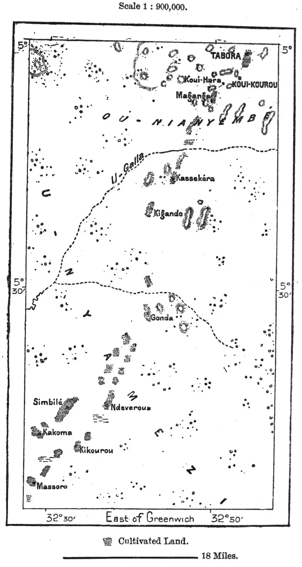 Thanks to Junker's surveys, a rough calculation may already be made of the actual extent of this vast fluvial system, which according to Léon Metchnikov is about 1,630,000 square miles. But the elements even for a remotely approximate estimate of the population are still lacking. From the accounts, however, of various explorers, who have visited many thickly peopled districts, twenty millions