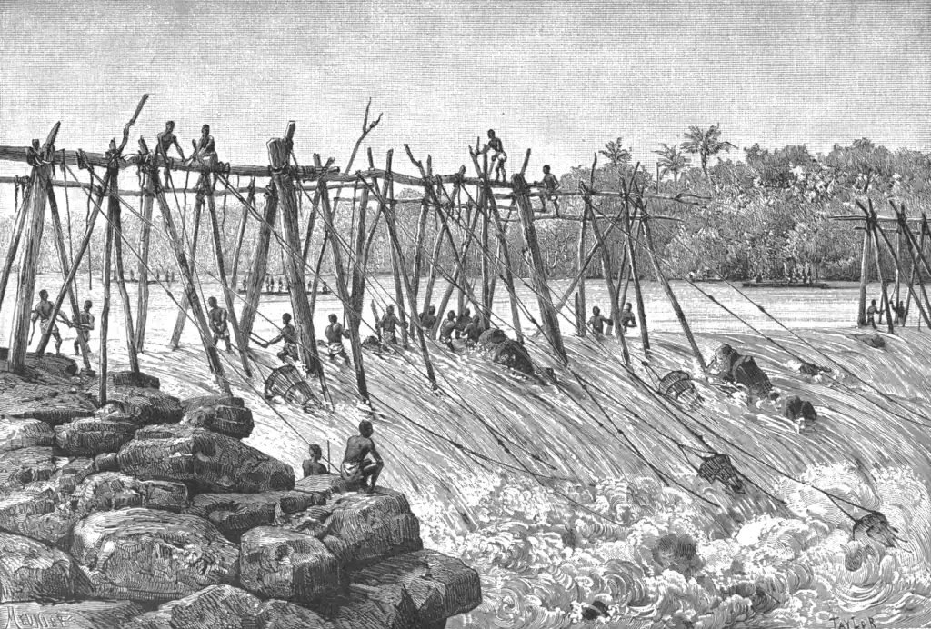 are war and fishing, leaving to the women all other occupations, such as trade, weaving, wickerwork, pottery, and other industries. Near the Manyanga in this district lies the chief trading-place between Stanley Pool and the coast. Below Manyanga, whose well-attended fair is held every eight days, the fortified station of Isangila marks the point where the river plunges from a vertical height of about 16 feet, and then describes a great bend southwards to the point where the Lu-Fu River leads to San-Salvador, former metropolis of the Congo empire.