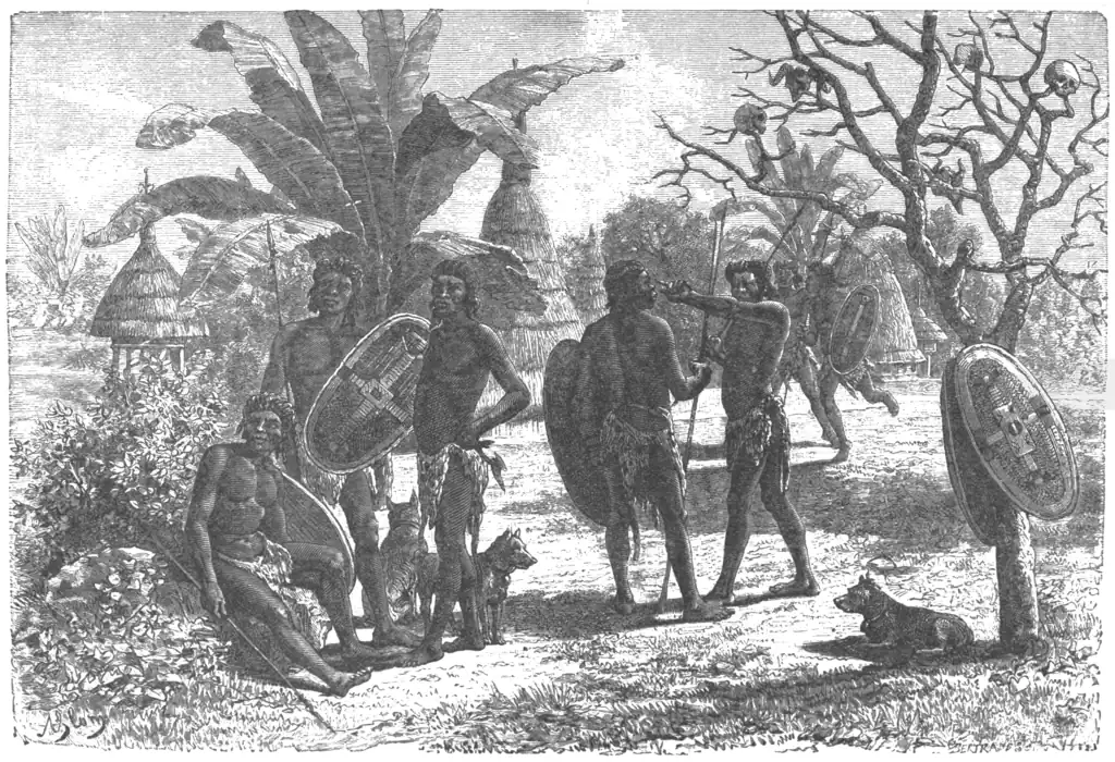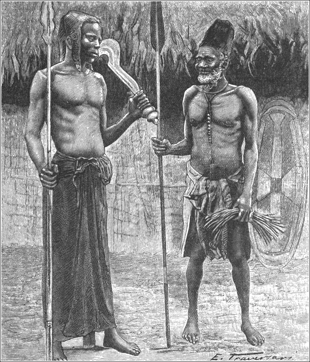 triangular mark on the body, and on the face a few spots tattooed in the form of a rectangle, as the sign of their nationality. The skin of an animal encircles their waist, and the chiefs adorn their heads with a leopard's fur, while all file the incisors to a point. Despite the soft rounded form of the features and bust, and the feminine elegance of their coiffure, the Zandehs are distinguished amongst all Africans by their noble carriage. The trunk may perhaps be somewhat long compared to the lower extremities, but they are none the less noted for their marvellous agility, using their offensive weapons, such as the spear and dart, with dangerous dexterity.
