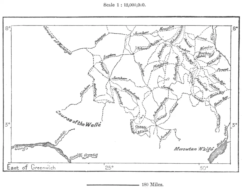 memorable expedition, the subsequent journeys of Bohndorff, Lupton, Potagos, and Casati added details of a secondary interest only to the rich and varied information supplied by that pioneer. But it is otherwise with Junker's journeys, the publication of which must certainly be regarded as a geographical event of primary importance for our knowledge of this part of the continent. Of equal if not greater importance are the data supplied by the expedition undertaken in 1887 by Stanley, to force the passage from the Congo to the Upper Nile for the purpose of relieving Emin Bey's Egyptian forces, stationed at Wadelai, and cut off from the northern route by the revolt in Eastern Sudan.