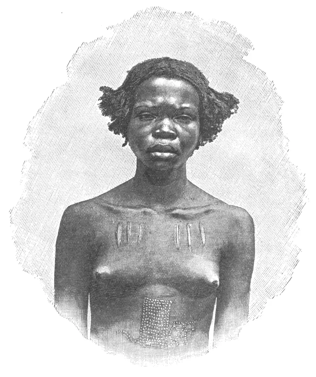 in the shape of peas and wens, differing with most individuals, but imparting to all a loathsome appearance. Grenfell mentions a young girl who had a wen on both sides of the nose as large as a pigeon's egg, which prevented her from looking straightforward. In order to recognise anybody, she had to lower her head to allow the glance to avoid the obstruction caused by these "beauty spots."