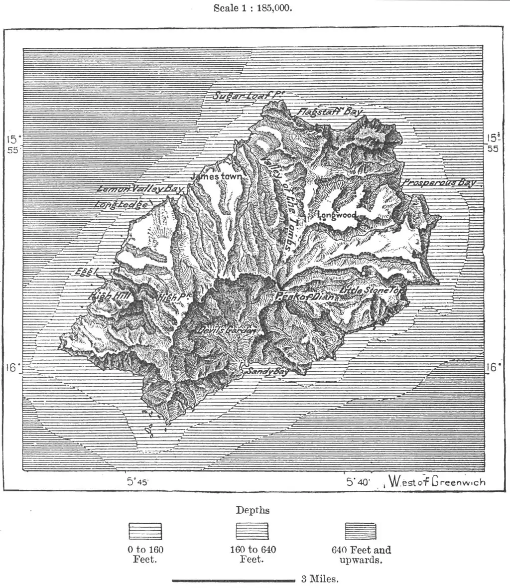 the sea into huge billows. Heavy rollers also break on the rocky shores even in calm weather. Flora and Fauna. - The large island is encircled by a broad belt of gigantic seaweed [Macroeydis pyrijera), forming a veritable forest of algae over a third of a mile wide, in which plants from 180 to 200 feet long are very common. These fucus, which take root at an average depth of 90 feet, facilitate landing on the island by deadening the fury of the waves. Tristam da Cunha constitutes an independent oceanic group, which probably at no time formed part of the mainland. Hence it possesses a special flora, with forms which are again found in the islets of Saint Paul and Amsterdam in tbe Indian Ocean, nearly 100 degrees of longitude farther east. These curious plants, thus covering such a vast range and developed under the influence of an analogous climate, comprise some heaths and a prickly grass {Sjmrtina arundinacea) growing in large tufts on all the lower slopes, in many places so interlaced as to be quite impenetrable. The only tree in this insular flora is the Phyliba arhorea, which in some places attains a height of 20 feet and upwards, but which usually bonds its distorted stem down to the ground. It forms, with the drift-wood on the east coast, the only available fuel of the inhabitants. The plants of the European and American temperate zones thrive well in the sheltered dells — cabbage, beet- root, turnips, onions, yielding rich crops sufficient for the local wants and for the supply of passing vessels. The pears, peaches, and grapes are also excellent ; but the cultivation of maize and wheat has had to be abandoned owing to the ravages of the mice. No reptiles have been discovered on the islands, nor apparently any insects, the only indigenous animals being mews, penguins, the stormy petrel, albatros, and some other aquatic birds. The pigs now running wild are certainly of European origin, although introduced at an unknown date. The goats, however, which were also at one time numerous, have disappeared for some unexplained reason. The domestic cat has given rise to a wild breed, which at times contends successfully with the dog, and which commits great havoc in the poultry-yard. The chief resources of the people are their cattle, sheep, hogs, rabbits, and game. Some of the cattle are exported to Saint Helena, and some domestic animals let loose in Inaccessible have also greatly multiplied. Inhabitants. Tristam da Cunha has been inhabited since 1811, when the American sailor Jonathan Lambert settled here with two companions, and began to clear the ground. In 1816, the British Government fearing a secret expedition might here be organised to deliver the prisoner of Saint Helena, placed a small garrison in the island. In 1821 the men, being no longer needed, were withdrawn ; but a few 100 WEST AFEICA. soldiers obtained leave to remain, and since then the colony has been maintained, at times increased by a few shipwrecked sailors, at times diminished by emigration of young men, or of whole families, eager to escape from their narrow ocean home. In 1865, during the war of Secession, an American corsair landed forty prisoners on the island without providing for 'their support. On other occasions the crews of passing ships have forcibly obtained supplies from the little colony of settlers, who have nobly avenged themselves by hastening to the succour of vessels often stranded on their rocky shores. If left to itself, this little insular community might perhaps be able to subsist and develop, thanks to the uniform excellence of the climate. The families are said never to lose their children young, so that the natural increase by the excess of births over deaths is considerable. The natives, issue of Europeans, Americans, and Hollanders from the Cape, married to half-caste women from Saint Helena and South Africa, are a fine race, remarkable for the grace and harmony of their proportions. In 1886 they numbered a hundred and twelve souls ; but fifteen adults, or one-fourth of all the able-bodied members of the community, were soon after swept away by a terrible storm. English is the language of these islanders, who constitute a small republic, whose " president " is the patriarch encircled by the largest family group. They recognise the sovereignty of Great Britain, which occasionally affords some help to the vassal colony. Saint Helena. Although situated fully within the tropics, between 15*^ and 16^^ south latitude, and 1,400 miles nearer to the equator than Tristam da Cunha, St. Helena was discovered only four years earlier, that is, in 1502, by the Galician Juan de Nova, who here lost one of his vessels. The island may, however, have been sighted by some previous navigators, for some lands are figured in these waters on Juan de la Cosa's map, which was completed in 1500. Lying within the zone of the regular south-east trade winds, St. Helena occupies a very favourable position on the highway of ships homeward bound from the Indian Ocean. But the nearest continental land is the Portuguese province of Mossamedes, South- West Africa, distant 1,140 miles due west. Although still nearly double the size of Tristam da Cunha, with a total area of about 30,000 acres, St. Helena is little more than the nucleus of what it must once have been. The present cliffs, in many places rising 2,000 feet sheer above the water, are encircled by a sort of bank or terrace with a mean breadth of two or three miles and flooded to a depth of from 300 to 600 feet and upwards. This sub- merged land, which rises abruptly from the marine abysses, forms the pedestal of the old volcanic mass, of which a mere fragment now survives. And when it covered a wider extent, the island also rose vertically to a greater height. But while the waves were incessantly attacking its foundations, its uplands w^ere exposed to the ravages of rains and running waters. This twofold work of erosion, SAINT HELENA. 101 continued for unnumbered 