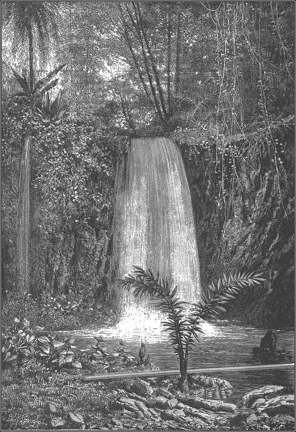 blue waters is mirrored the foliage of the surrounding orange-groves. The dense and sombre woods of the interior are contrasted lower down by a girdle of more delicate verdure, consisting of palms and bananas."