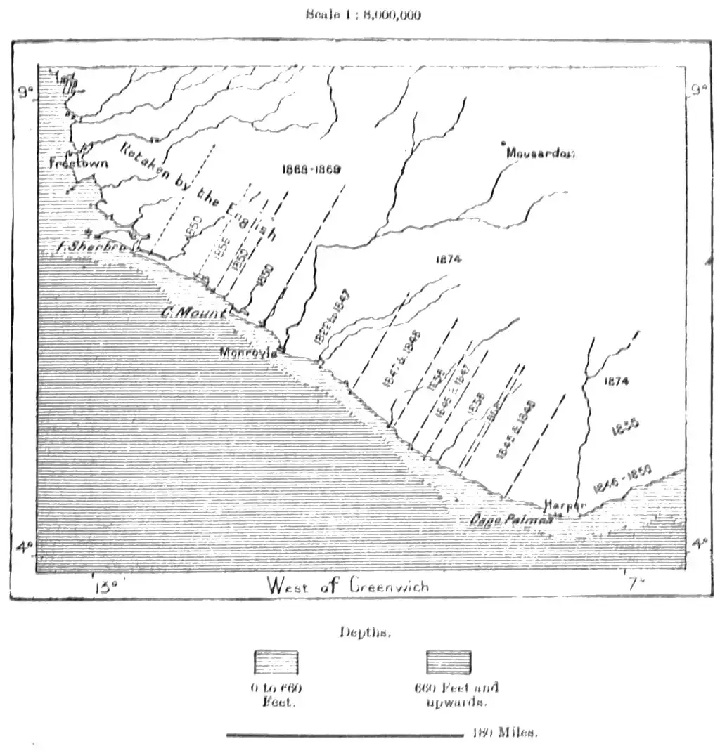In 1815 some forty American Negroes were brought over to Sierra-Leone by a Wealthy fellow-countryman of Massachusetts, and next year an American society was founded for settling emancipated slaves on the African seaboard, whence their ancestors had been carried off. But the first expedition under its auspices did not take place till 1820. It was directed to Furah Bay in the Sierra-Leone estuary; but having been badly received by the English, the settlement was removed in 1822 to a bay commanded by Cape Mensurado, 210 miles south-east of Freetown. After tho first difficulties were surmounted the colony gradually expanded, strip after strip of territory being added year after your, and parcelled out in the American fashion in geometrical parallel lines at right angles with the coast, But the settlement did not yet constitute an independent state, and continued to be administered by delegates of the American society, whence arose frequent diplomatic difficulties, tho English traders on the coast refusing: to pay customs to a private company, At last the society surrendered its claims, and the revolutionary your, 1848, saw the birth of the new Negro Republic on African soil,