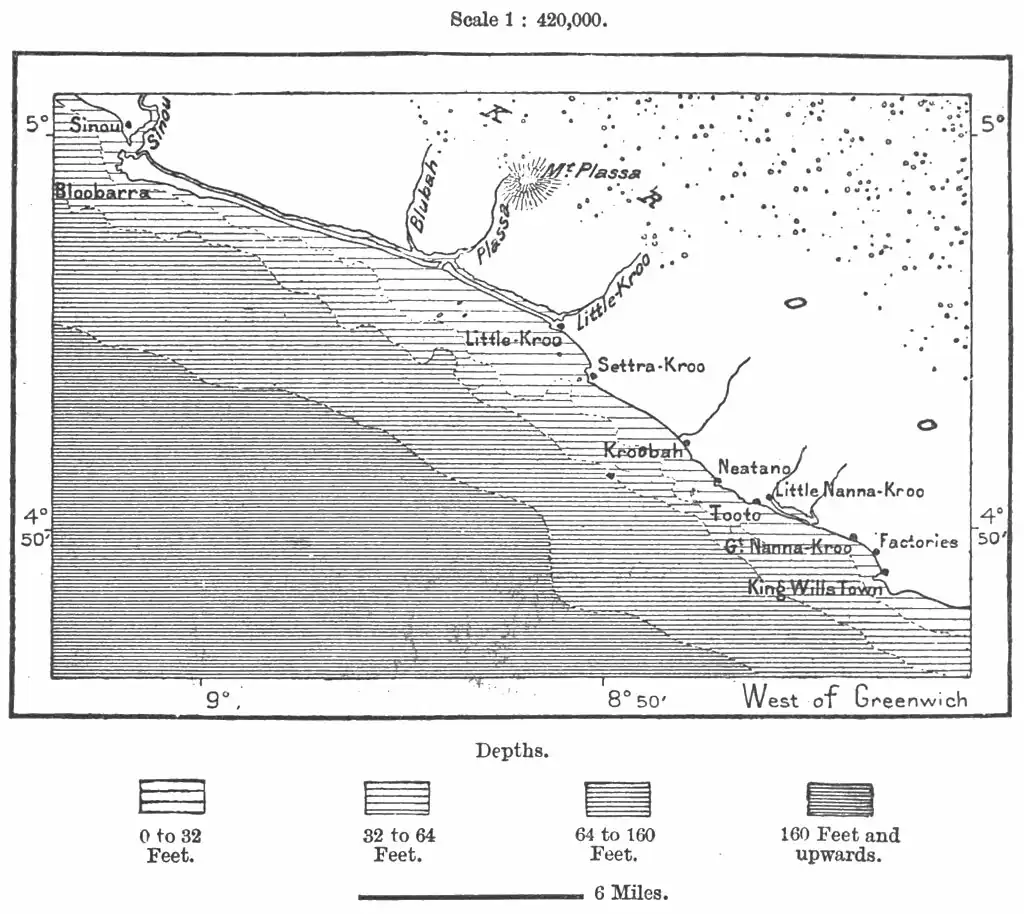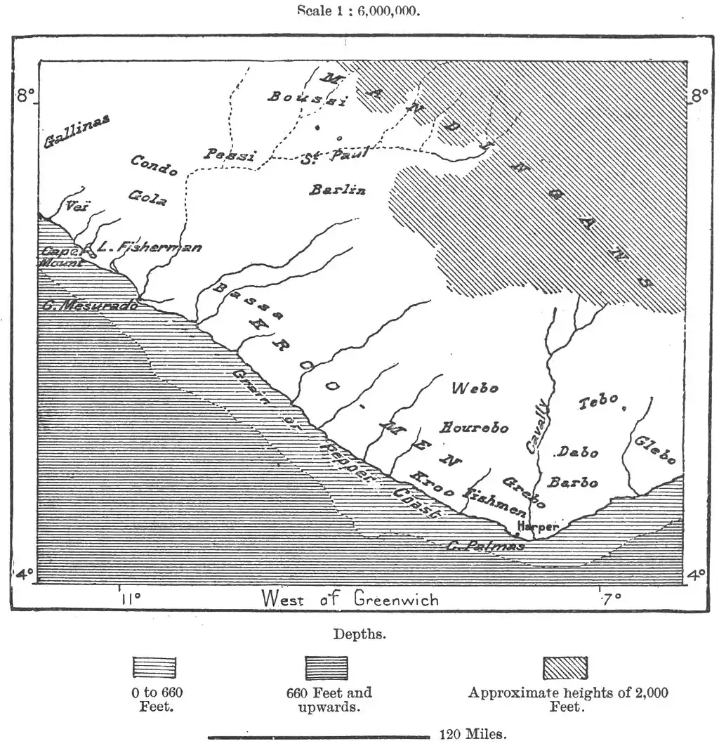 East of Cape Palmas the coast-line develops a curve of surprising regularity stretching for 370 miles eastward to Cape Three Points. The greater part of this gently curved seaboard takes the name of the Ivory Coast, and also that of