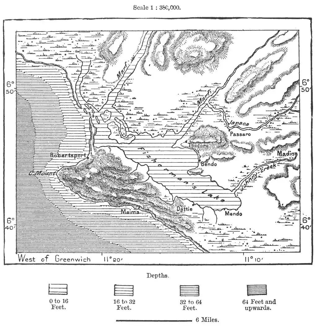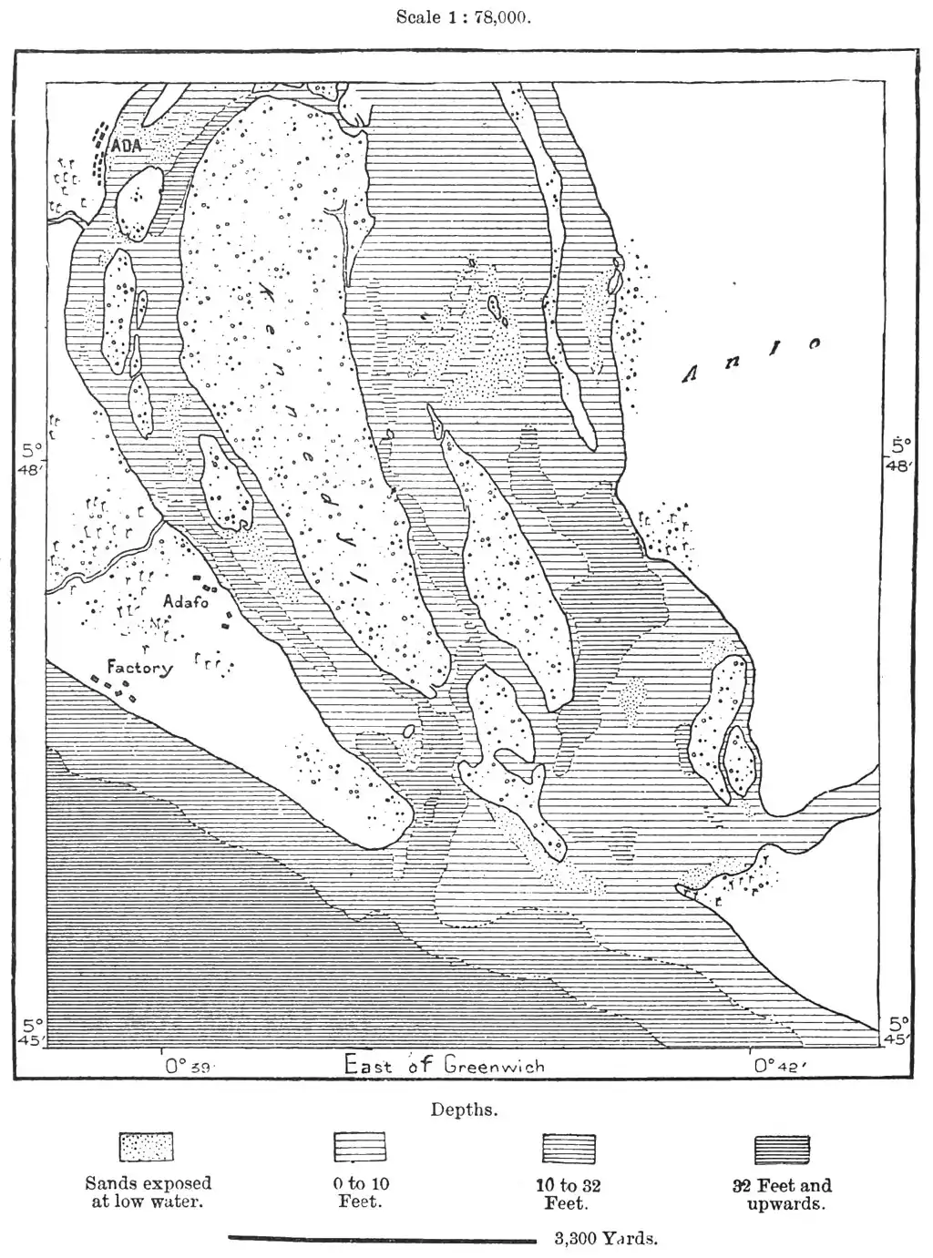 The latter has been ascended to a distance of 60 miles from its delta in the Assini lagoon, but on the Kinjabo all navigation is soon arrested by the Aboiso Falls. Both rivers, as well as their tributaries, are washed for gold, the tenacious clayey soil of their beds yielding an average of about two shillings the cubic metre. On the slopes north of the lagoon, Chaper has discovered boulders and clays of glacial origin. Thus for a space of 900 miles, from the south Senegambian rivers to the Gold Coast, traces are presented of former glacial action.