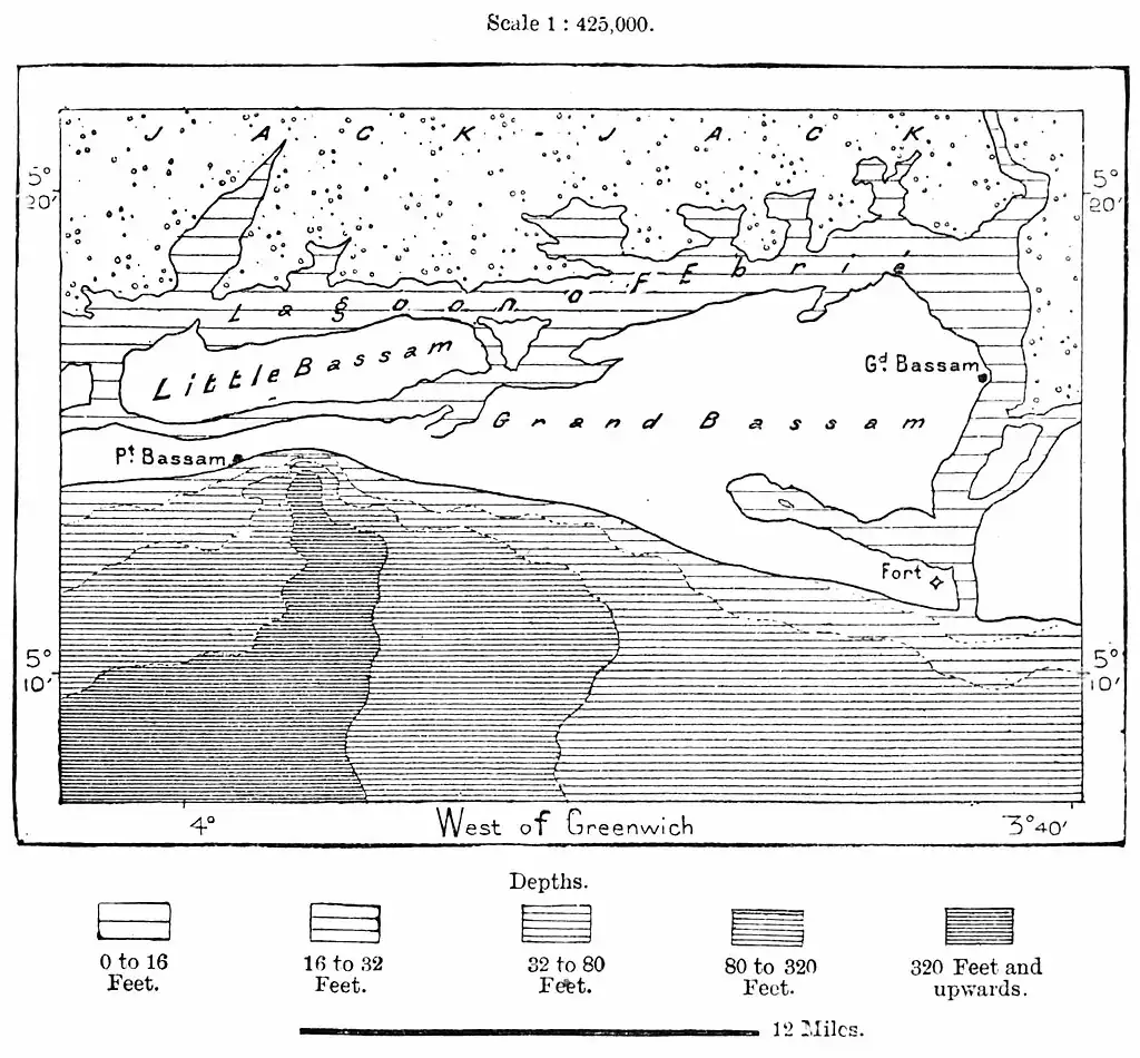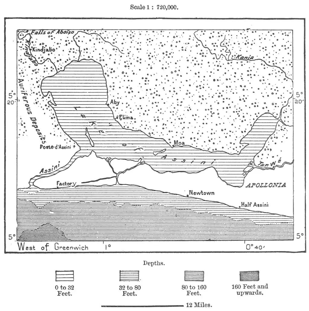 The approach to the Assini (Issini) lagoon, some 22 miles farther east, resembles that of Lake Ebrié, but is shallower, more tortuous, and inaccessible to craft drawing more than 5 feet. But in the interior the lagoons ramify into numerous deep creeks and inlets, the two chief influents being the Bia or Kinjabo in the north-west, and the Tanwé, forming in the east the frontier of the French possessions.