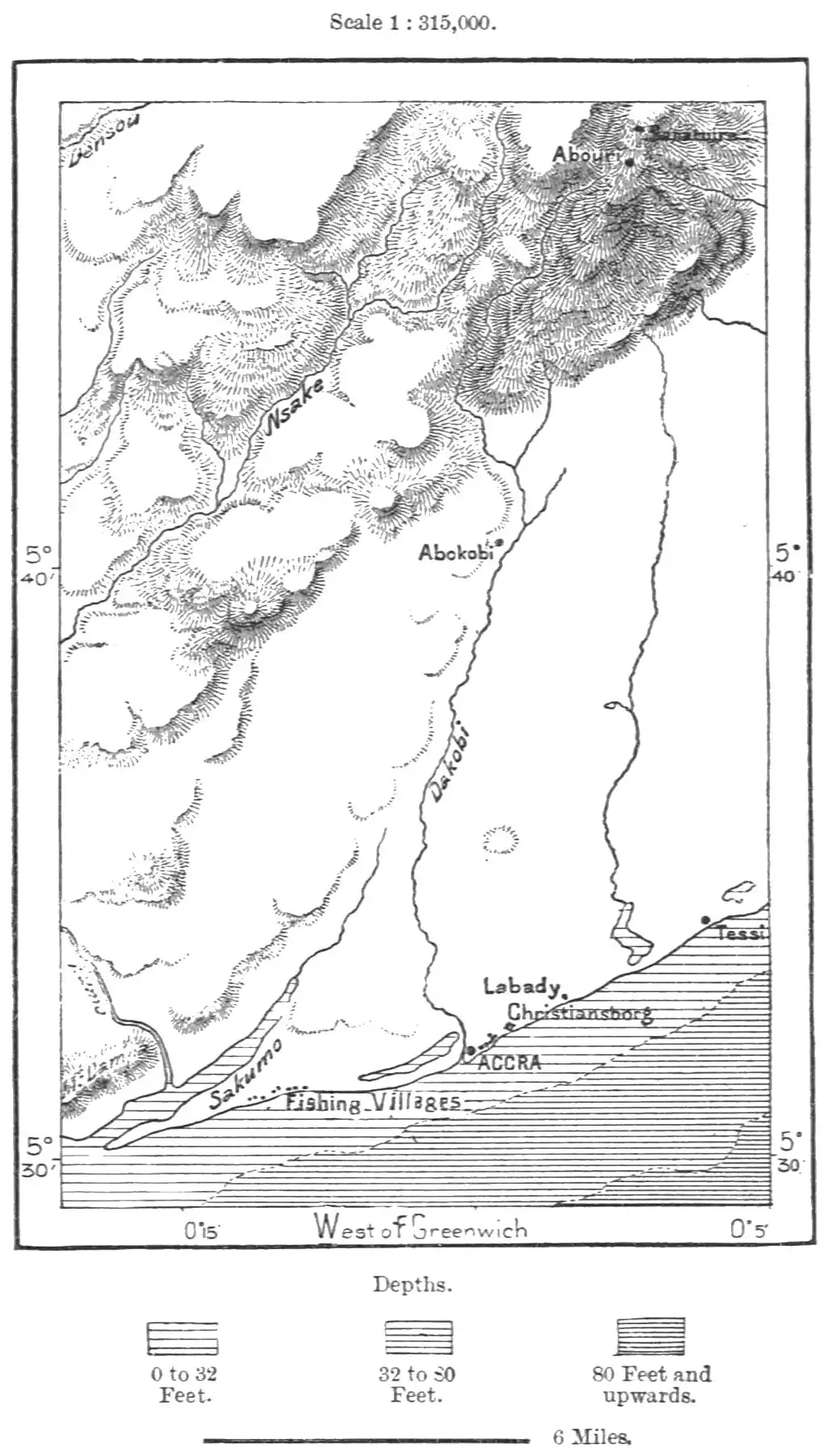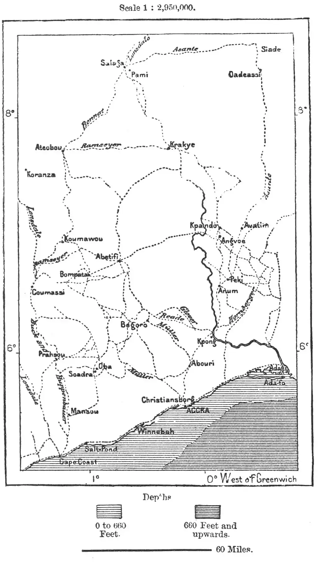 Nevertheless other nations also in due course found their way to the Gold Coast. The Dutch made their appearance towards the close of the sixteenth century, and after expelling the Portuguese, purchased the Brandenburg settlements founded in 1682 on Cape Three Points. The Dutch were in their turn driven out by the English, who in 1850 claimed the whole coast, except a few Danish and Dutch factories. The former were purchased by the English, the latter and acquired in exchange for the rights possessed by the British to certain territories in Sumatra. But the surrender of the Dutch factories in 1871 involved the English in hostilities with the natives, which terminated with an expedition against the Ashantis and the destruction of their capital. Since then the whole country has been traversed by surveyors and pioneers, and even in the conterminous territories the routes of explorers are continually expanding. THE GOLD COAST. 237 Physical Features. Tlio whole seaboard of the British possessions projects seawards beyond the normal coastline. But the most prominent headland is Cape Three Points, whose granite, diorite, sandstone, laterite, and conglomerate hills terminate in three sharp peaks. Several of the promontories at this angular section of the coast rise to a height of about 350 feet, and one of the inland summits 12 miles from the sea attains an altitude of 2,000 feet. Most of these hills in the interior are either isolated, or else disposed in short ridges, such as the Ajamanti group north-west of Accra. But north of this town occurs the dome-shaped Dampa, the first summit of the Akwapem hills, which develop a true range running north-east and gradually increasing in elevation. Beyond the gorge pierced by the river Volta, this range is continued nearly in the same direction through the Busso country towards the lofty crests of North Dahomey. West of the Volta other ridges branch o£P from the Akwapem system. Such are the Okwahu hills, which run north-east, merging in a broad plateau 2,200 feet high, which falls southwards through a series of abrupt terraces, but slopes gently northwards to the thinly peopled steppes beyond the Okwahu territory. West of these grassy plains a few isolated masses 1,600 or 1,700 feet high, form the escarpment of the less elevated Ashanti plateau. Such are the Adansi hills, which have become famous in the history of recent wars, their densely wooded slopes forming the natural frontier of the Ashanti" country on the route between Cumassi and Cape Coast. In this hilly district lies the Bussam Och^, or " Sacred Lake," a landlocked lacustrine basin, which has become one of the great fetishes of the country. The fish here captured are smoked and exported, wrapped in banana leaves, to every part of Ashanti. North of the hilly zone stretch vast plains strewn with a few isolated bluffs, such as the majestic rocks resembling Gibraltar which Lonsdale met on the route between Cumassi and Bontuku. The grassy plateaux are con- tinued north-westwards to the still unexplored highland region generally known by the Mandingan name of " Kong," or " Mountains." But in the Salaga and Jendi territories north-east of Ashanti these Kong Mountains are completely inter- rupted, so that the route from the Upper Volta to the Niger is nowhere obstructed by any elevated ranges. EivER Systems. Copious streams descend from the hills and upland plains forming the water- parting east of the Upper Niger. In the w^est the first important river is the Ancobra, or Ankobar, which encircles the promontory of Cape Three Points, falling into the Bay of Axim through a broad mouth with a sill scarcely 7 feet deep. The Ancobra rises at least 150 miles from the sea, in the Ashanti country between the basins of the still larger rivers, Tanvv^^ and Boosum Prah, whence it flows south-west and south through Wassaw, one of the richest auriferous districts on the Gold Coast. Its name is a corruption of the Portuguese Rio da Cobra, or "Snake River," so called from its numerous meanderings.