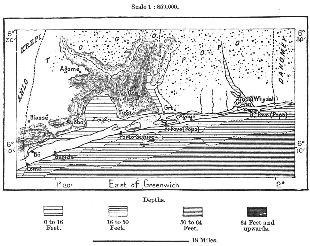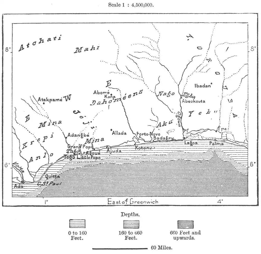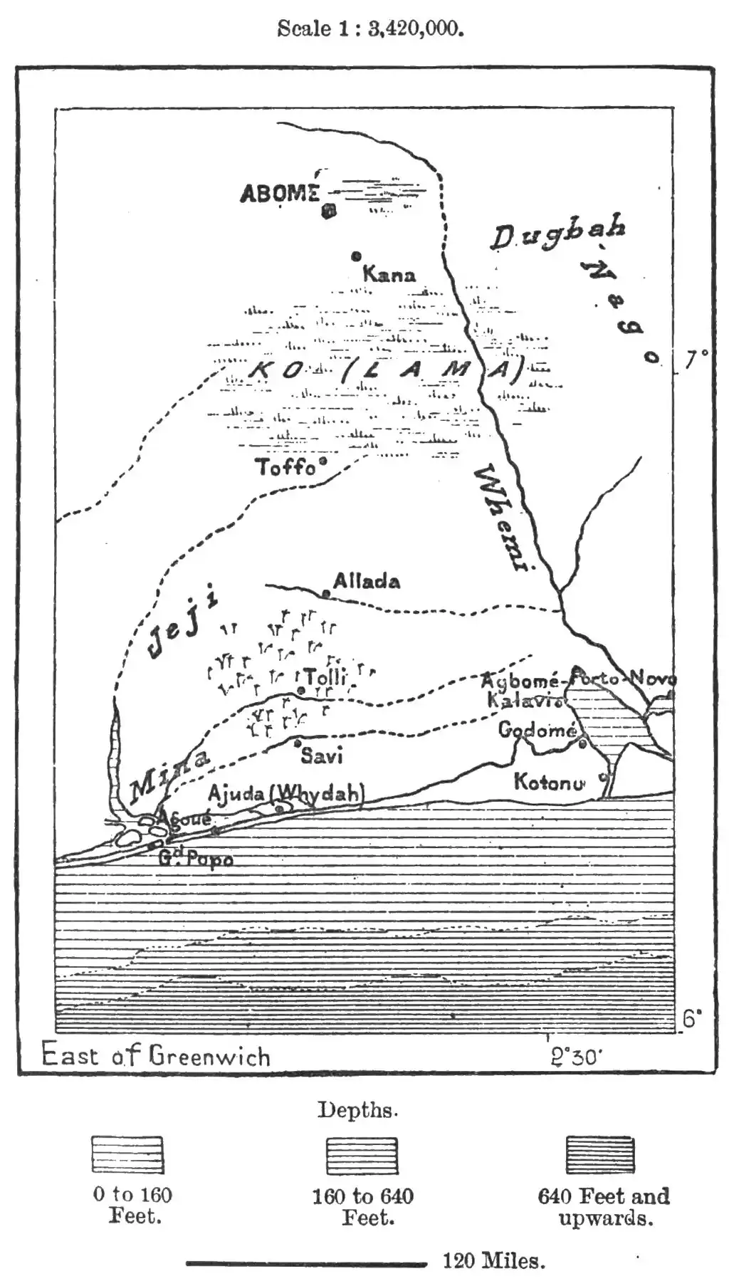 On the route to Agbomey the first station is Savi (Xavier), former capital of the kingdom of Whydah, whose sovereign was said at one time to command two hundred thousand troops. Beyond Savi the route passes by Tolli, and Allada, the ancient Adara, also formerly the capital of a state, and still regarded as the metropolis of Dahomey, one of the royal titles being "Lord of Allada." Yet the place Fig. 118. — Danomey and Ajuda Coast. was ruined by the Dahomey people themselves in 1724, when they conquered the seaboard route and massacred the inhabitants of Allada.