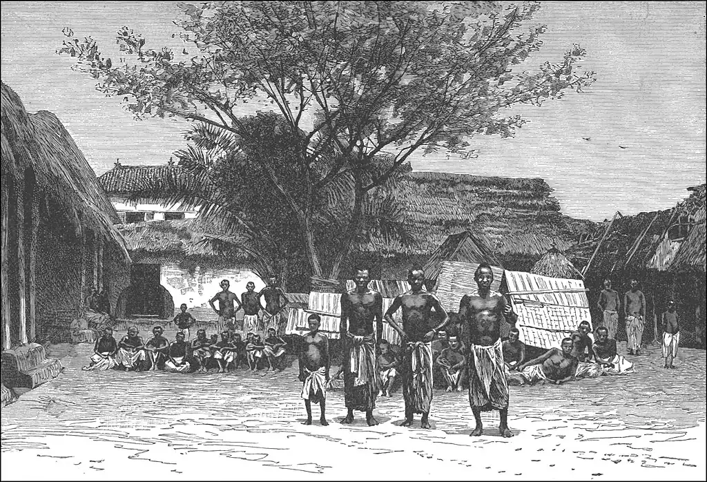 The natural limit which formerly separated the states of Allada and Dahomey is the extensive swamp of Ko, or Lama, easily traversed in the fine season, but almost impassable during the rains. In 1784, the most difficult points were bridged and the road partly raised, but soon again subsided. North of Ko begins the true continental coastline, and here, on a terrace over 1,000 feet above the sea-level, but easily accessible from the south, stands Abomey (Agbomey), capital of Dahomey, a "City within an enclosure," as the name signifies, with monumental gates, deep ditches, and a thick-set wall of thorny trees. Abomey covers an extensive area, but most of the enclosed space consists of gardens and ruins, while the aggregate of huts called the palace is alone two miles in circuit. The wall of this residence was formerly stuck all round with human heads or skulls, eloquent witnesses of the royal power. But the Minister of Portugal, the protecting state, no longer tolerates the massacres till recently required by custom, and nothing is now seen except the iron spikes on which once stood the hideous trophies.