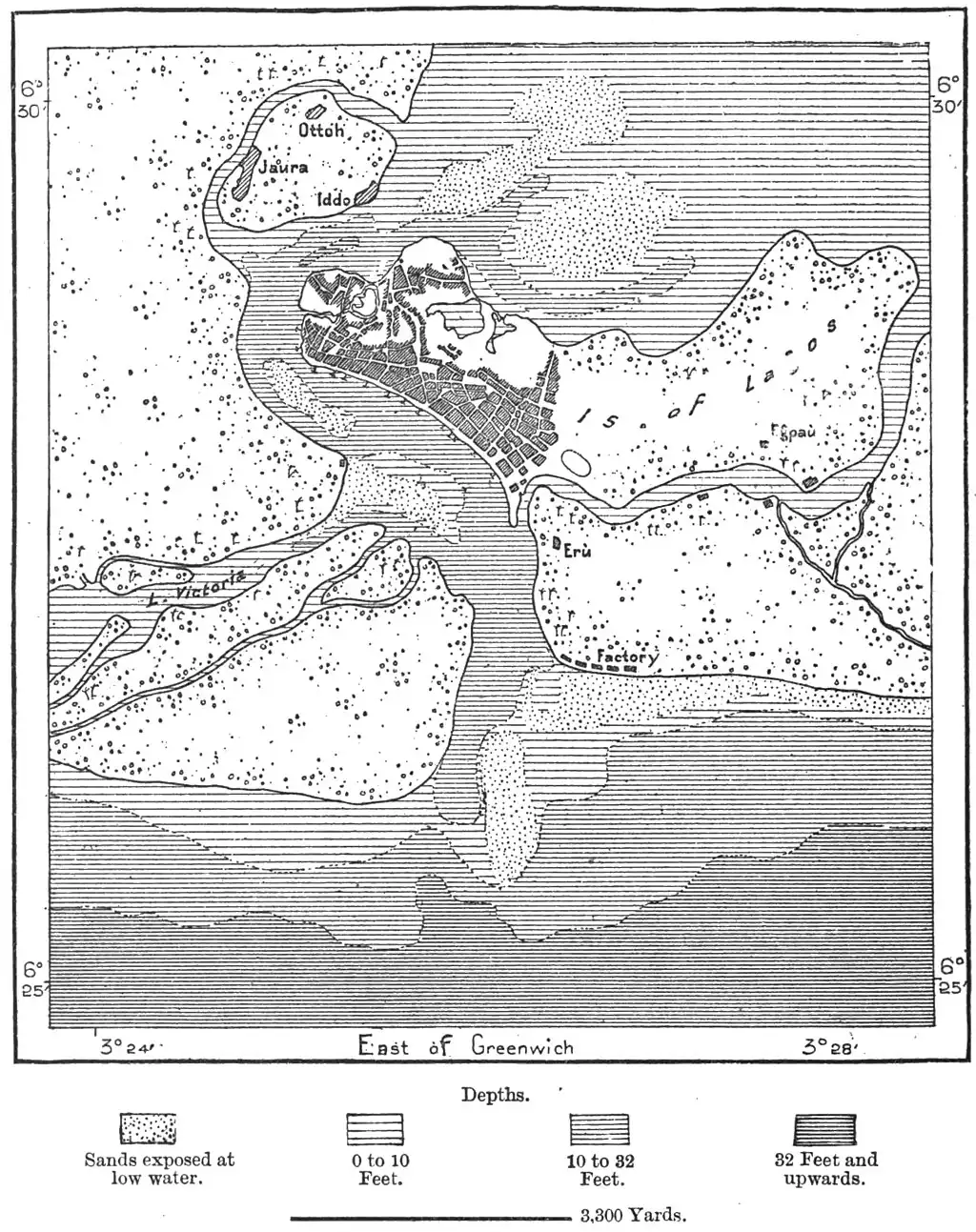 Avon, an inland sea 1,200 square miles in extent, and so called from the English vessel which surveyed this coast in 1846. But the size of the Haho, as the natives call it, from its chief influent, has been strangely exaggerated, for it is scarcely more than 6 miles long in any direction. The Nokhwé, or Lake Denham, west of Porto-Novo, is also much smaller than it appears on the maps, while the largest of all these coast lagoons is Ikoradu, which with its numerous ramifications has given the Portuguese name of Lagos, or the "Lakes," to the town at its seaward entrance. These lagoons form a continuous waterway, which might be easily