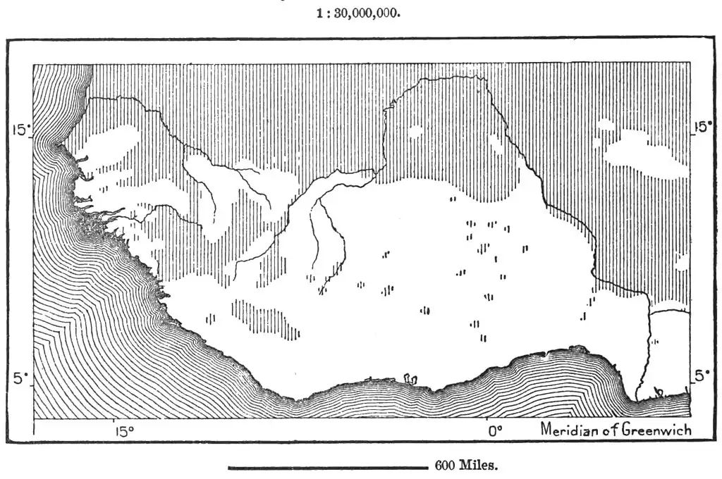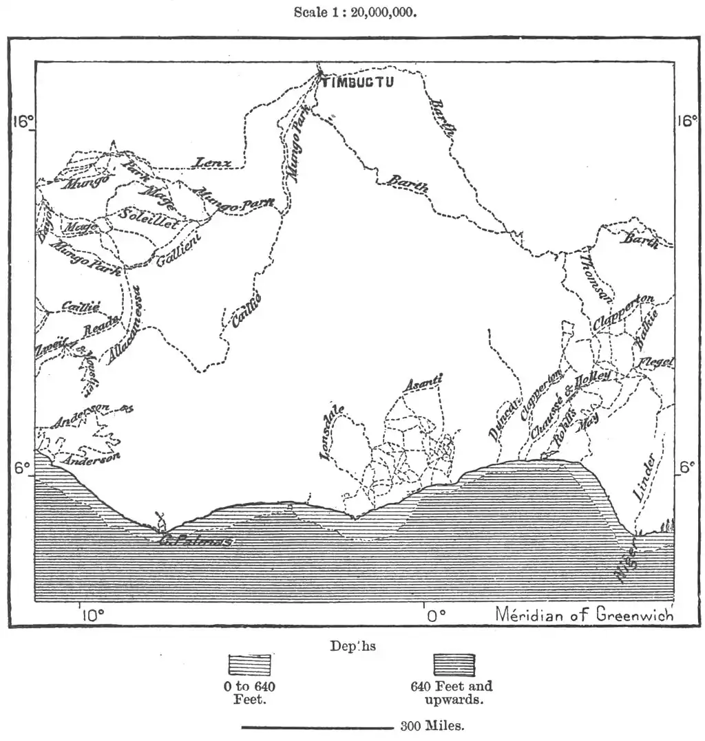 The Niger, one of the great rivers of the globe, ranks third in Africa for the length of its course, and second for volume, being in this respect surpassed by the Congo alone. From source to mouth the distance in a straight line is only 1,100 miles, but by water no less than 2,500 miles, this great disparity being due to the fact that the river, flowing at first northwards in the direction of the Mediterranean, penetrates into the Sahara and then sweeps round to the east and south. The basin thus developed cannot be estimated at less than 1,000,000 square miles, including all the regions of the Sahara depending upon it by the slope of the land and direction of the intermittent or dried-up fluvial valleys. The whole of the 276 WEST ATEIOA. Tsad system, with the Sliari and its other affluents, might even be regarded as belonging to the Niger basin, the divide between the two hydrographic regions being extremely low, and the general aspect of the land showing that at a former geological epoch both systems were connected by intermediate channels. It is even probable that, before piercing the coast ranges barring its passage southwards to the Gulf of Guinea, the Niger flowed eastwards, developing vast inland seas, of which the Tsad is a surviving fragment. Possibly the " Nile of the Blacks " may at that time have really effected a junction with that of Egypt, through the low- water-parting between the Upper Shari and the numerous streams flowing to the White Nile. In that case the Benue, at present its great affluent from the east, would have been the branch for communicating directly with the Atlantic. Tra- versing regions exposed to a much heavier rainfall, the Benue, although shorter, has even now an equal, if not a greater volume, than the main stream itself. In the joint Niger-Benue basin the population is very unevenly distributed, certain tracts on the Saharian slope arid elsewhere being uninhabited, whilst others are densely peopled, with numerous large towns, villages following close together, and the whole land forming a continuous garden. The actual population is esti- mated by Behm and Wagner at forty millions, although judging from the detailed descriptions of travellers, it can scarcely amount to half that number. In any case it is certain that throughout a long historic period, powerful com- mercial and industrial nations have succeeded each other in the Niger basin. Like the Nile, this river was a centre of culture, and its cities became famous throughout Northern Africa, and even beyond the continent. The kingdom of Ghana, whose name under the form of Guinea, has been so widely diffused along the western seaboard, was known to the Venetian traders long before it was visited by any European travellers, and for centuries Timbuktu figured in the imagination of the western peoples as a sort of remote African Babylon. The Niger affords a striking example in support of the law of primitive cultures, recently expounded by Leon Mechnikov. Here also, as in the Iloang-ho, Indus, Euphrates, and Nile basins the riverain populations have been very irregularly developed, nor were the inhabi- tants of the fluvial deltas anywhere the first to reach a higher state of civilisation. Progress was always most rapid in the interior, where were first constituted national groups sufficiently powerful and industrious to play an important part in the history of mankind, and transmit their fame to remote regions. While such nations were being developed along the Middle Niger, the natives of the delta remained in a barbarous state, blocking the approach to the sea from the civilised inland peoples. Progress of Discovery. Thus it happened that, for four centuries, Europeans frequenting the seaboard remained profoundly ignorant of the true course of the great Nigritian river. Even Mungo Park still supposed that it reached the Atlantic through the Congo, and it was mainly in the hope of verifying this theory that Tuckey's disastrous expedition up the Congo was carried out in 1816, while Peddie was to join hands with him by descending the Niger! Yet in 1802, the geographer Reichard had already traced on the map the true mouth of the river, although even he made it pass through Rennell's "Sea of Wangara," now identified with Lake Tsad. It was only in 1830 that the brothers Lander determined its true lower course by actual exploration; nor is the survey of the whole river yet quite completed. It began with Mungo Park, who devoted his life to the problem, and who in 1796 reached the Niger at Segu, which he found already as large as the Thames at Westminster, and flowing slowly towards the east. From this point he followed it for 120 miles down to Silla, and for the same distance up to Bamaku, thus apparently verifying Herodotus' account of a great river flowing "from west to east" across