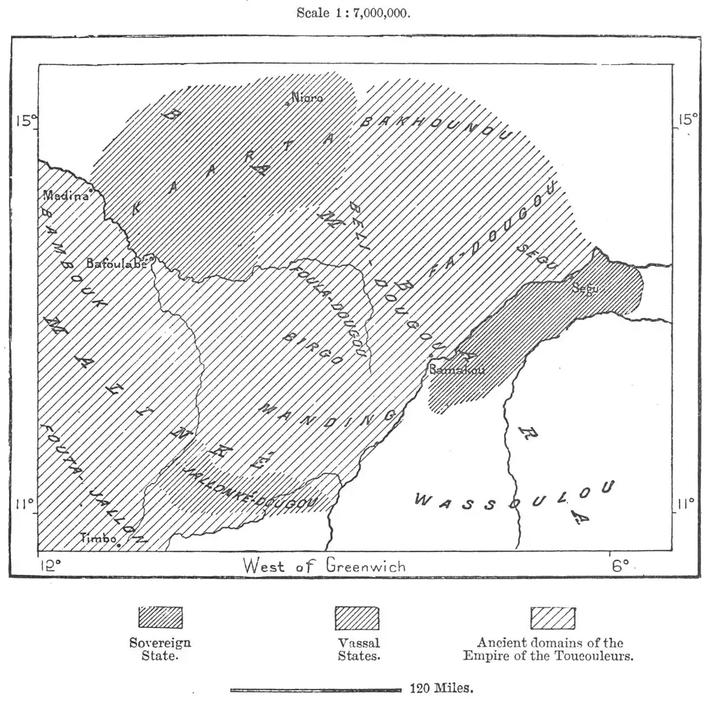 On the other hand, the Toucouleur empire below the French protectorate on the left bank of the Niger has entered on a state of decadence. It was founded in 1850 by the pilgrim Omar, who after overrunning the Jallonké country, received a first serious check at the French station of Medina in 1857. But although defeated on the Senegal, Omar was still victorious on the Niger, reducing Kaarta and Bele-dugu, and advancing through Segu and Massina to Timbuktu. After his death family dissensions, followed by the revolt of the oppressed Bambaras and Mandingans, brought about the dismemberment of the state, which was broken into detached fragments by the advance of the French to the Niger. The