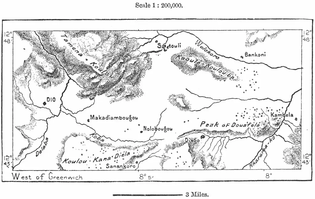 The Mandingan state, also now a French protectorate, has some flourishing places on the left bank of the Joliba and in the interior on the waterparting between the Niger and Senegal basins. Such are Kangaba, on the Joliba, and Sibi on a bluff rising above an extensive alluvial plain to the west. Bamaku (Bamako), formerly a populous trading-place much frequented in the time of Mungo Park, has again