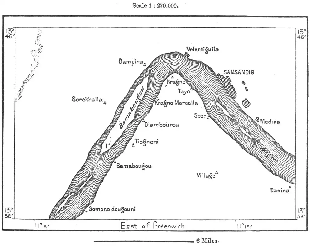 The ruined city of Yamina (Nyamina) on the left bank, 60 miles below Kulikoro, belonged till recently to the empire of Segu; but in 1884, on the