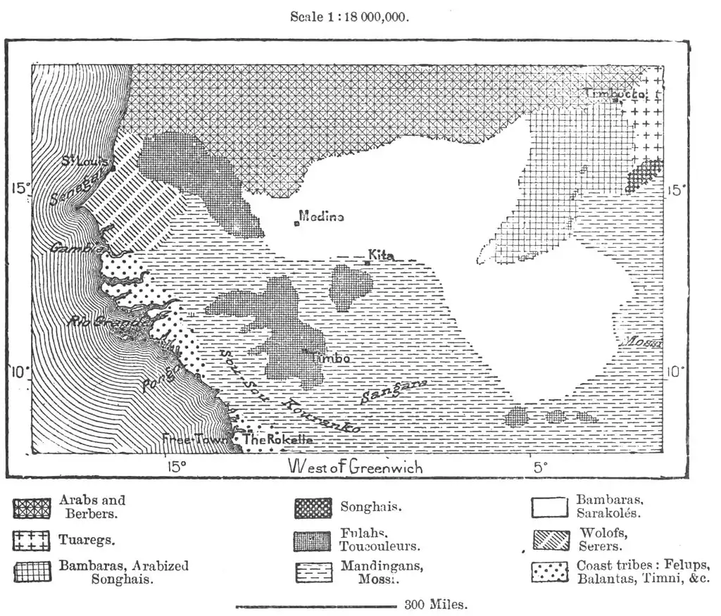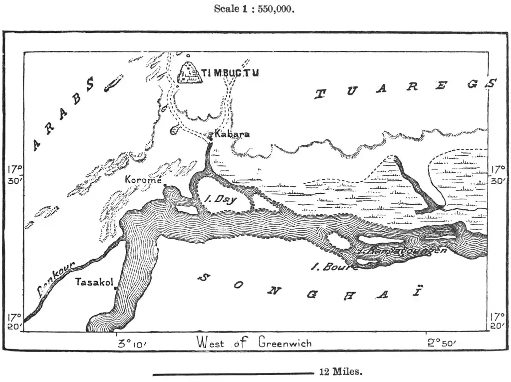 below Timbuktu. Then came the conquering Fulahs, founders of the Massina empire, and the nomad Tuaregs, who planted themselves on both banks of the river, so that the Songhais are now almost everywhere subject to peoples more powerful than themselves.