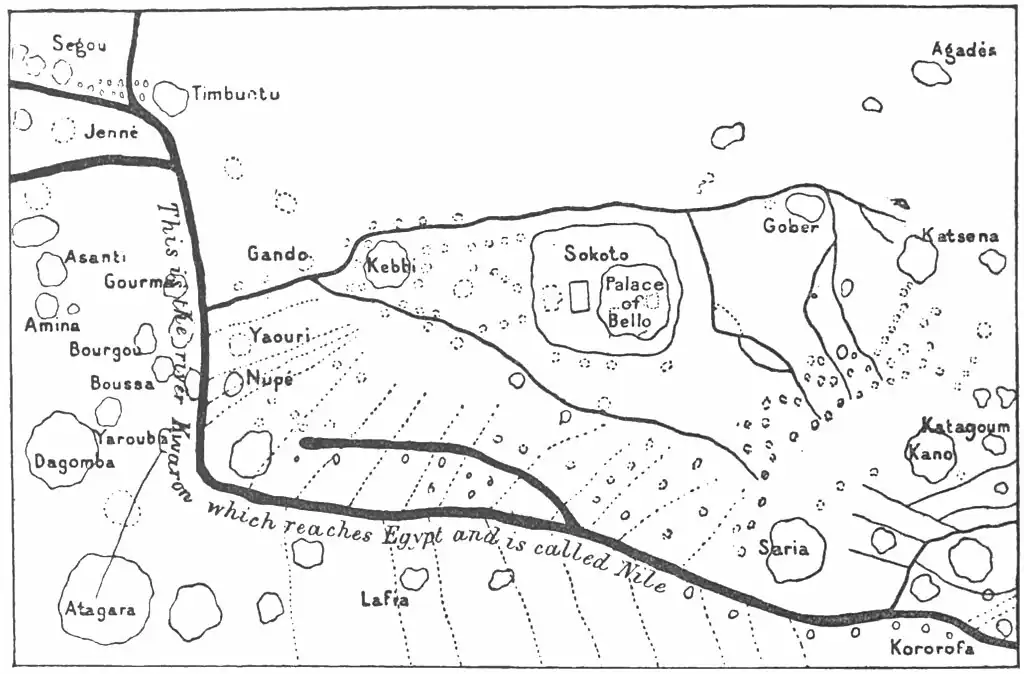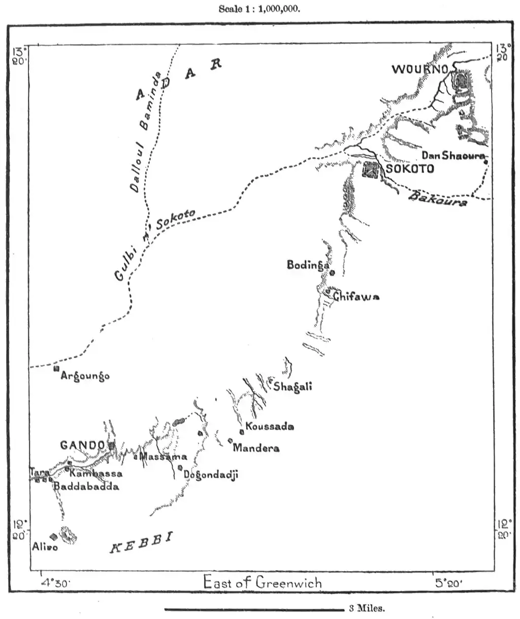 follow Duchi, lost amid a labyrinth of rocks; Sansané Aïssa, one of the strongest places in the empire; Alkalawa, formerly capital of Gober, on the banks of the Sokoto at the northern verge of the dense forest of Gundumi; lastly, Konni, one of the chief places in Gober, two days to the north-west.