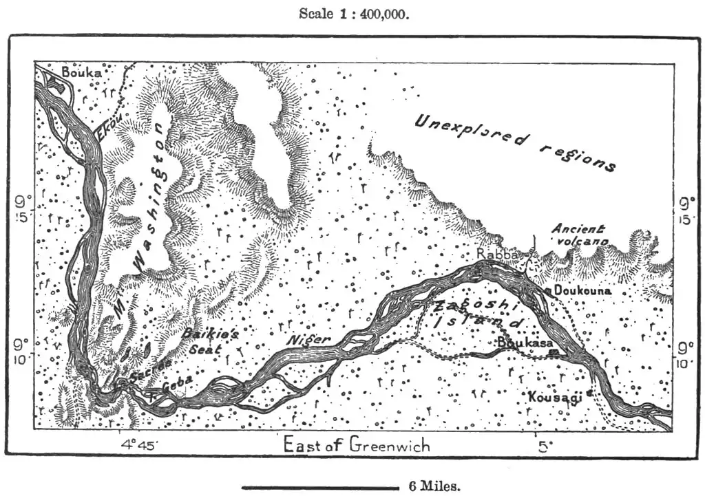 In 1832 Laing reached the hilly district where the headstreams have their source, and in 1869 Winwood Reade crossed the Joliba itself within 110 miles from its origin. Ten years later, Zweifel and Moustier came within sight of the Tembikundu hill, the fountain-head of the sacred river; but the spirit of the waters, represented by a suspicious high-priest, barred their farther advance. Of the upper course the best known section is naturally that which forms the present boundary of French Sudan for a distance of about 300 miles between Falaba and Sansandig. But even here the side branches and eastern affluents have been traced on the maps only from the reports of native traders. Below Timbuktu the