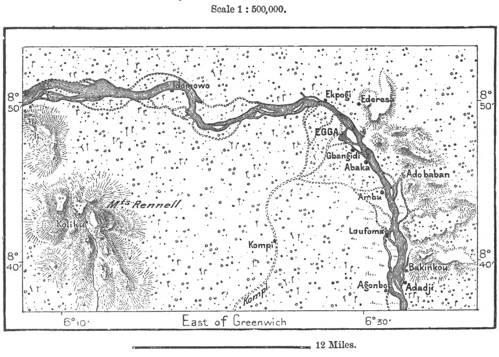 Loko, on the right bank of the main stream, 90 miles above the Lokojo confluence, is the busiest place in the Benue basin. It is the largest ivory market in West Africa, exporting annually from fifty to sixty tons of this commodity. Midway between Loko and the confluence the Benue is joined by the Okwa (Kogna), from the Seg-Seg country, where lies the great city of Keffi Abd-es-Senga,