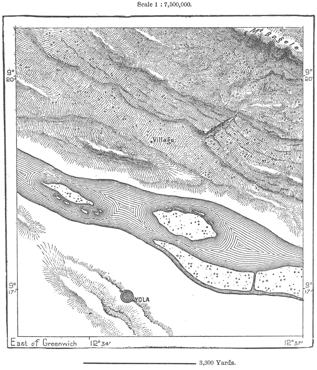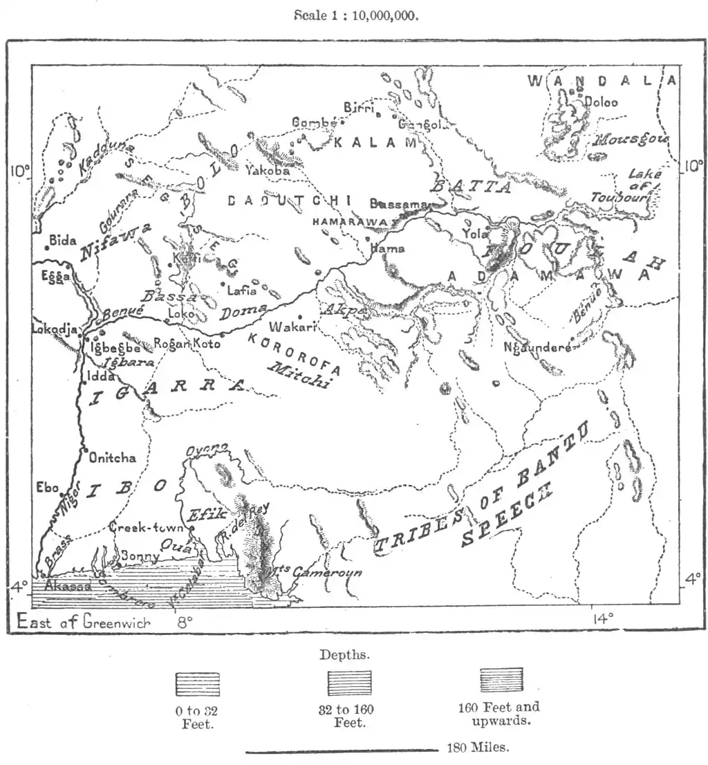 Of the Benue the most striking feature is its slight incline, estimated at scarcely 600 feet in a total course of as many miles, and falling from about 900 feet above sea-level at the head of the navigation to 270 at the confluence. Thanks to the explorations of Baikie, Ashcroft, and Flegel, the navigable section is well known; but the region of its farthest headstreams still remains unvisited. According to Vogel, Hutchinson, and others, the Upper Benue is connected, at least during the floods, by a continuous line of navigable channels with the Shari and Lake Tsad. From the Tuburi swamps, discovered by Vogel at an altitude of about 1,000 feet above the sea, the superfluous waters flow in one direction northwards to the Logon branch of the Shari, in another westwards to the Mayo Kebbi, apparently the largest headstream of the Benue, which descends from the neighbouring Ngaunderé Mountains. After the confluence the united stream, already 500 or 600 feet wide, winds westwards between sandstone hills rising many hundred feet above its bed, which at many points is obstructed by rocky ledges, rendering all