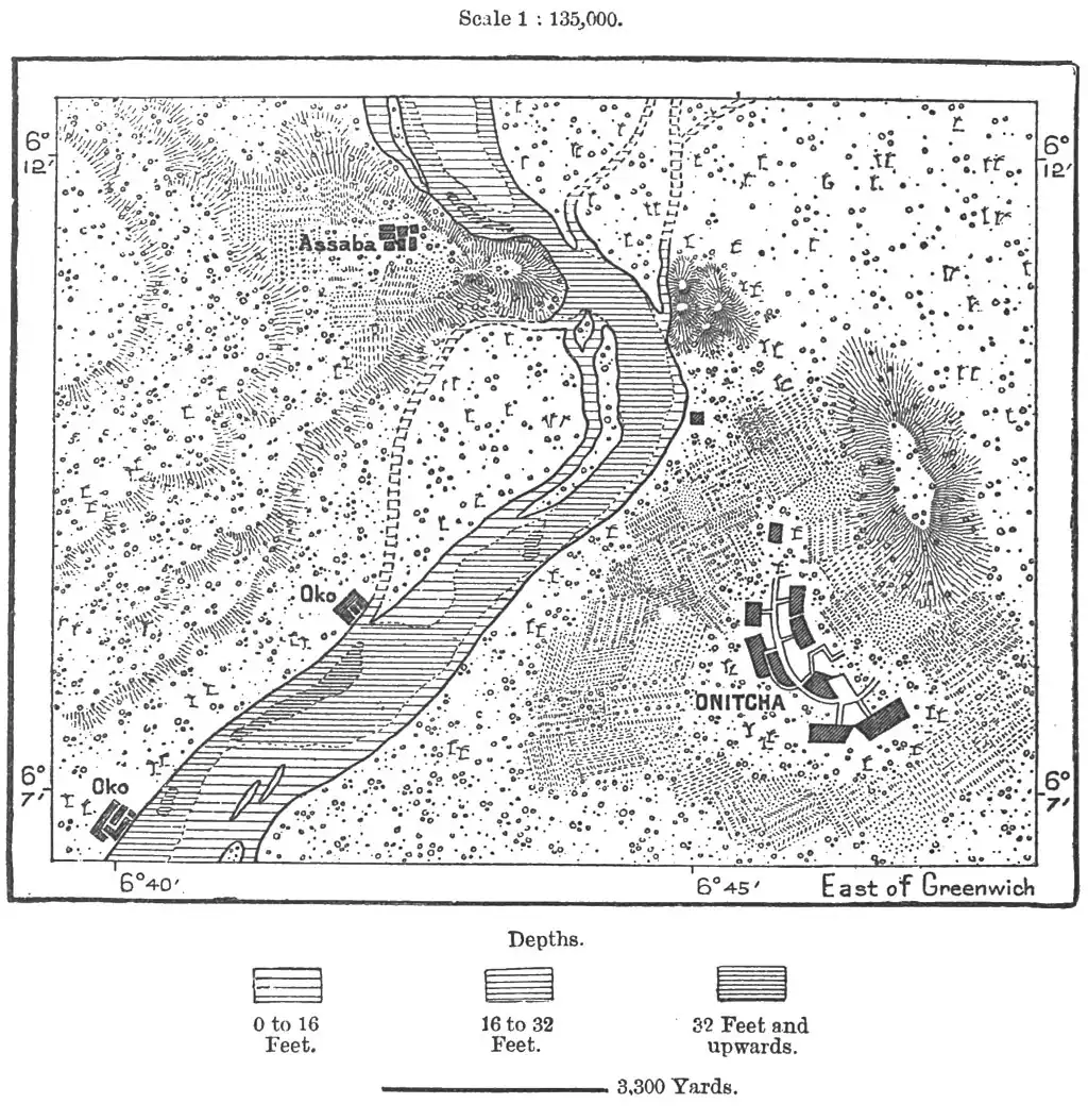 Onitcha, a still larger place than Idda, lies about 2 miles from the left bank on a well-cultivated terrace rising 130 feet above the low-water level. Ona bluff a little higher up on the opposite side stands the town of Assaba (Assabua), where the English have also some factories. Till recently no one could be ennobled in Assaba without offering a human sacrifice to the local genii, and the town contained no less than four hundred of these dignitaries, Thanks to its position. about half-way between the Niger-Benue confluence and the mouth of the Nun, Onitcha hag become the most important depôt along the whole course of the Niger, and has also the advantage of water communication with some very populous districts on both slopes of the river. The local "king" is now obliged to remain permanently within the precincts of his palace, because custom requires a human victim every time he goes abroad. Once a year only, that is, during the yam feast, he is allowed out to take part in the public rejoicings. In the midst of the unexplored forests stretching eastward lies Aro, the mysterious "city of sins," where are made great sacrifices of animals, and perhaps of men, for the cleansing