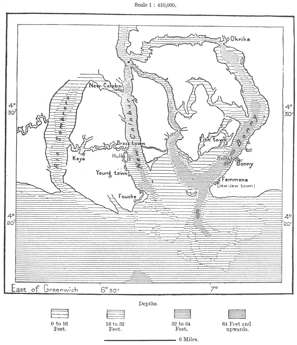 Brass, the first important trading-place east of the Nun, lies some distance from the coast amid the network of channels connecting the Niger with the Bonny. Here are a few factories on the very verge of the forest, but much of its